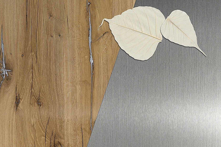 Dabei lässt sich das Eichendekor auch schön mit anderen Metallic-Effekt-Dekoren wie dem Dekor "Flash" (r.) kombinieren. Hier liegt der Clou in der besonderen Struktur einer gebürsteten, metallisch wirkenden Oberfläche, die im Wohnbereich wie beispielsweise in der Küche interessante und hochwertige Akzente setzen kann. Der metallische Charakter wird durch den Einsatz von Effektpigmenten unterstrichen. Dadurch entsteht eine lebhafte Optik mit tollem Echtmaterialcharakter und einer homogenen Gleichmäßigkeit. "Flash" ist ein modernes, zeitgemäßes Dekor, das sehr natürlich wirkt.