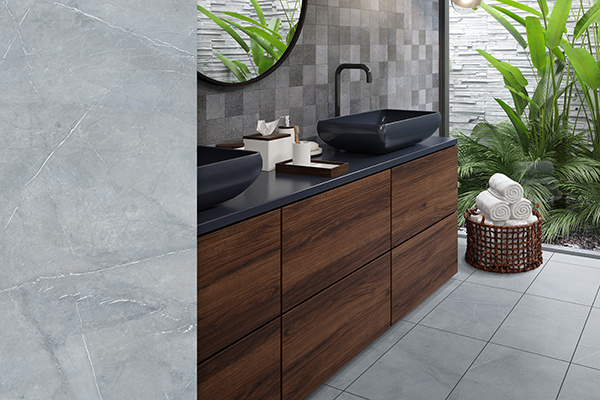 Als Grundlage für das Dekor „Grey Caspio" (o. r.) diente ein persischer Kalkstein mit natürlichen, feinen Kalzitadern. Ihr Verlauf wirkt edel, aber nicht zu großteilig. Durch die Invertierung des ursprünglichen Entwurfs entstand ein Steindekor mit dunklen Adern. Effektpigmente in Gold, Silber oder Bronze sorgen für eine raffinierte, edle Dekoroptik. Die Wirkung der Pigmentierung wird durch die schwarzen Steinadern möglich gemacht und verstärkt.