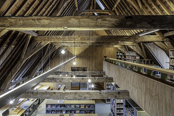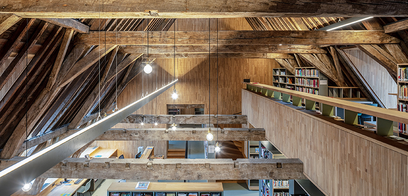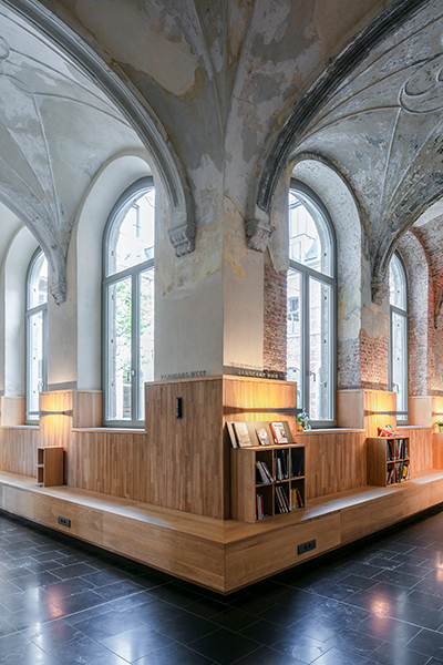 Die neuen Einbauten wie auch die Akustik-Verkleidungen in Eichenholz fügen sich ganz selbstverständlich in den Bestand ein und zeigen, wie harmonisch und gleichberechtigt Alt und Neu nebeneinander bestehen können. In den Fluren fanden die Akustikelemente als Wandverkleidungen und für den Bau umlaufender Sitz- und Lesebänke sowie bei den Regalen Einsatz. Das Dachgeschoss ist als zweigeschossiges "Bücherregal" mit Galerie und speziellen Lesebereichen gestaltet und bietet ausreichend Platz für die gesamte Sammlung der Bibliothek.