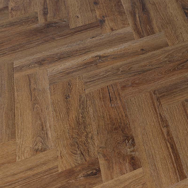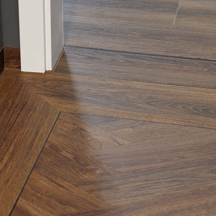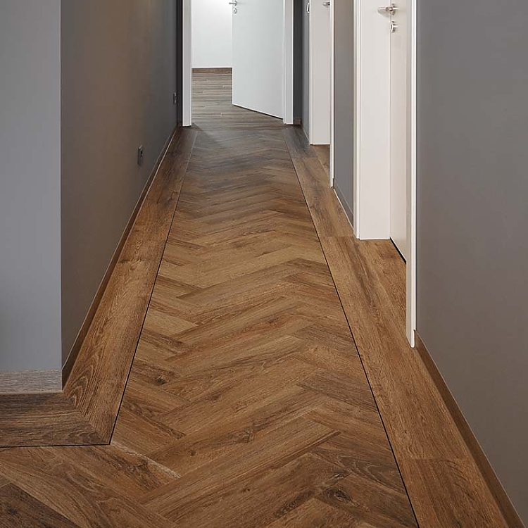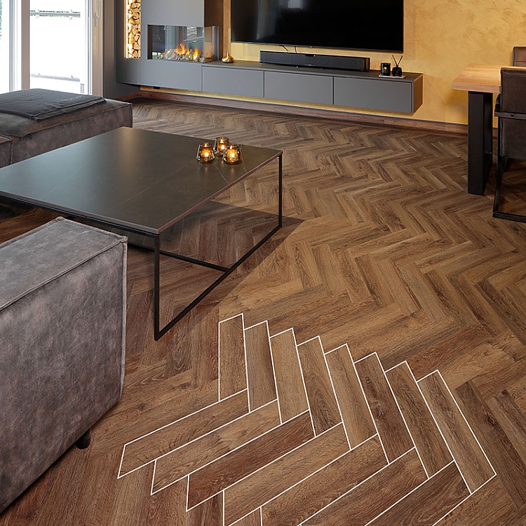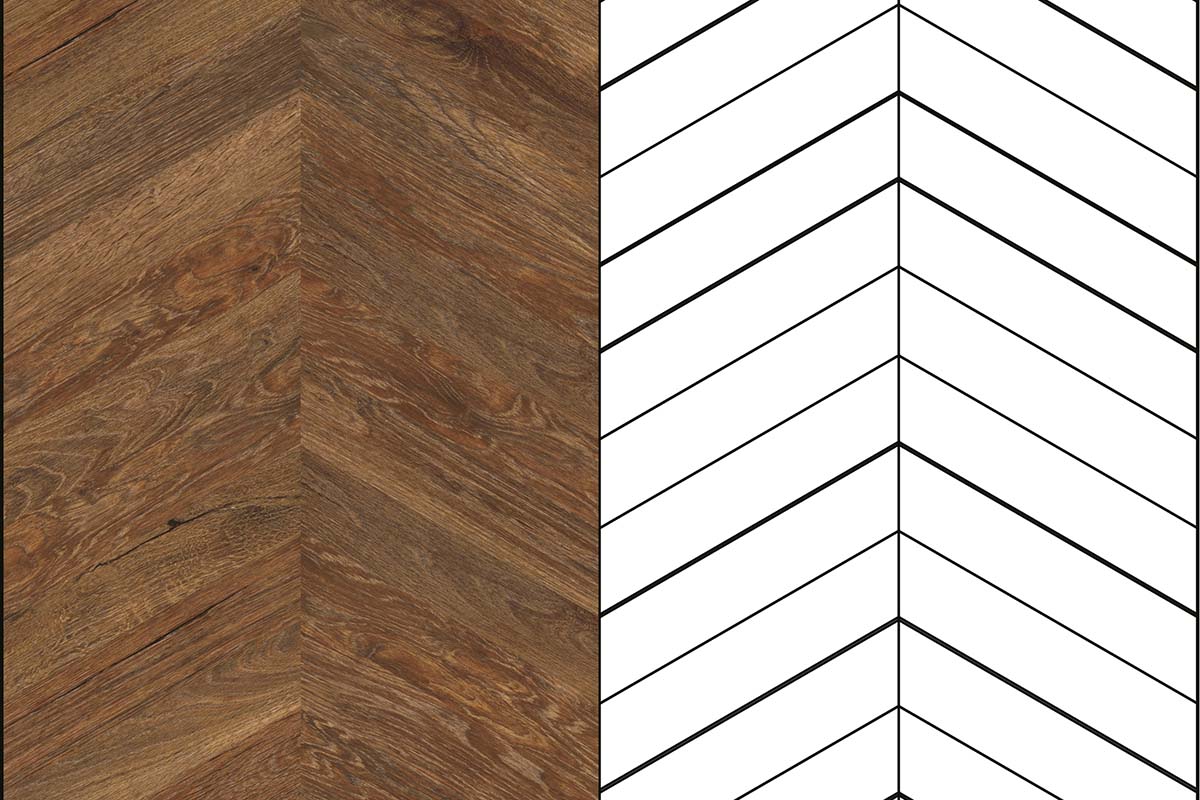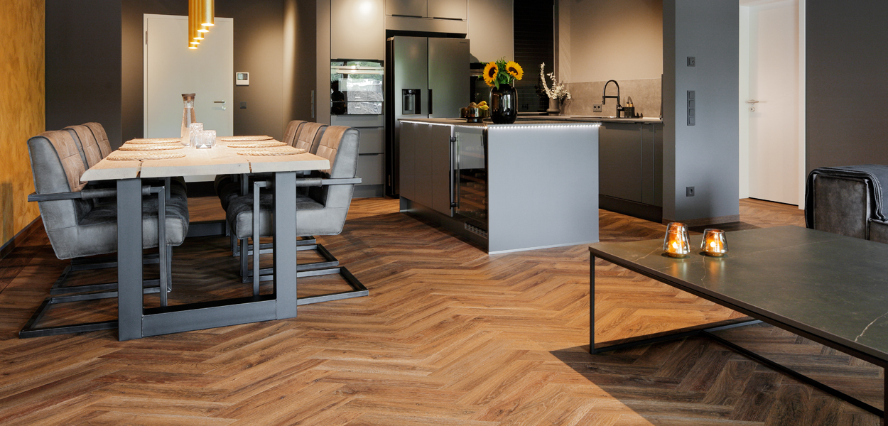 Bei dem gewählten Bodenbelag mit dem Dekor "PW 3130 FP" handelt es sich um ein Chevron-Dekor. Die in einem Winkel von 60° abgeschrägten Planken ermöglichen eine tolle auffällige Bodengestaltung, die an die Herrenhäuser des 17. Jahrhunderts erinnert. Neben den vorherrschenden kalten Farben des restlichen Interiors schafft der Boden mit der warmen Holzoptik einen gelungenen Kontrast, der für mehr Behaglichkeit sorgt. Auch durch die Verbindung von den klaren modernen Formen des Mobiliars mit dem klassischen Verlegemuster wird die Idee der Kombination von zunächst Gegensätzlichem konsequent fortgesetzt. Eine weitere Besonderheit des Bodens ist die ungewöhnliche Verlegerichtung. Die Chevron-Planken wurden in Fischgrätverlegung angeordnet. Das Ergebnis ist ein deutlich weiter geöffnetes Fischgrätmuster. Dass es sich hierbei um Chevron-Planken handelt, sieht vermutlich nur das Profi-Auge.
