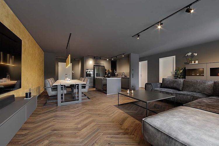 Die dunkle und kühle Farbe der Wände, Decke und der Möbel erhalten ein optisches Gegengewicht durch den Boden. Gewünscht und eingeplant war von Anfang an ein Holzboden. Parkett stand zunächst zur Diskussion, da zu dem Gestaltungskonzept in jedem Fall auch am Boden eine hochwertige Optik ergänzt werden sollte. Der Wohnungseigentümer wurde von Sliwa Harte & Weiche Bodenbeläge aus Recklinghausen, langjähriger Partner von Project Floors, kompetent beraten. "Es wurden uns sowohl Parkett als auch Designboden von Project Floors vorgestellt. Aufgrund der vielen Vorteile haben wir uns am Ende aber für den Vinylboden in der von uns gewünschten Holzoptik entschieden. Die Mitarbeiter von Sliwa haben dann unsere Ideen in die Tat umgesetzt. Eine tolle handwerkliche Arbeit, die grundlegend für unsere stillvolle Wohnung ist", begeistert sich der Eigentümer.
