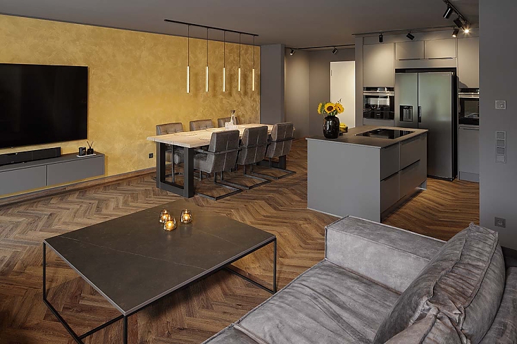 Auf 120 qm sind in einem Neubau Räume der besonderen Art entstanden. Die Wände inklusive der Decke sowie ein Großteil des Mobiliars sind in dunkelgrau und schwarz gehalten. Wer nun an eine dunkle Höhle denkt, der täuscht sich. Erstaunlicherweise geht das Konzept wunderbar auf, da durch die große Terrassentür viel Tageslicht hereinkommt und die Wohnung sehr gut ausgeleuchtet ist. Schienensysteme an der Decke sorgen dafür, dass die daran angebrachten Spots genau dort für Beleuchtung sorgen, wo Licht benötigt wird. Elemente in Gold, darunter auch eine ganze Wand im Wohnzimmer und die Leuchte über dem Esstisch, lassen etwas Glamour einziehen.