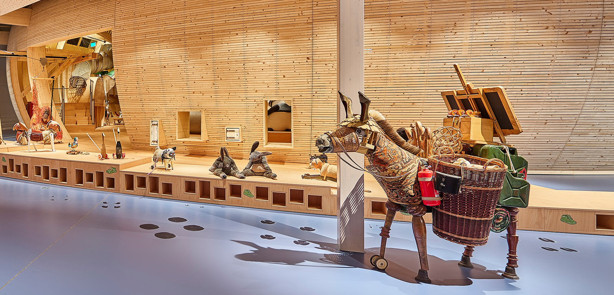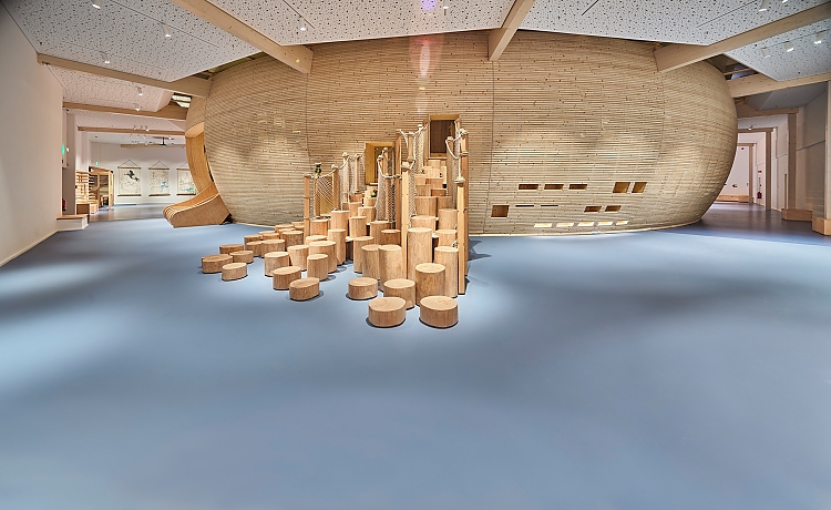 Entdecken, ausprobieren, spielen – die neue Kinderwelt "Anoha" des Jüdischen Museums Berlin ist ein Erlebnisraum für alle Sinne und bietet den jungen Besuchern viel Raum für Kreativität. Die Ende Juni 2021 eröffnete Dauerausstellung, die sich an Kinder im Kita- und Grundschulalter richtet, greift die Erzählung der Arche Noah aus der Tora auf: Herzstück ist eine sieben Meter hohe, kreisförmige Arche aus Holz, in die 150 verschiedene Tiere einziehen. Die Tier-Skulpturen wurden von 16 Berliner Künstlern aus recycelten Objekten hergestellt. Einige können vielfältig erkundet werden – mal sind sie Klettergerüst, mal Hängematte, mal Kuschelhöhle. Den Architektenwettbewerb zum Bau des Kindermuseums in der ehemaligen Blumengroßmarkthalle gewann das amerikanische Büro Olson Kundig Architects, die Umsetzung erfolgte in Kooperation mit dem Berliner Architekturbüro Engelbrecht als lokalem Partner. Der Einsatz von Materialien, die optisch und funktional das Ausstellungs- und Gebäudekonzept unterstützen, hatte für Planer und Bauherrn oberste Priorität. Der Kautschuk-Belag "Noraplan Uni" wurde auf den Flächen rund um den Innenraum der Arche sowie in den angrenzenden Räumen und den Mitmach-Werkstätten auf rund 1.900 qm installiert. Bei dem Design-Klassiker entschieden sich die Architekten für einen Blauton. Dieser symbolisiert durch seine Farbigkeit das Meer und fügt sich mit seiner matten Oberfläche und dem monochromen Erscheinungsbild ideal in das reduzierte Designkonzept ein.