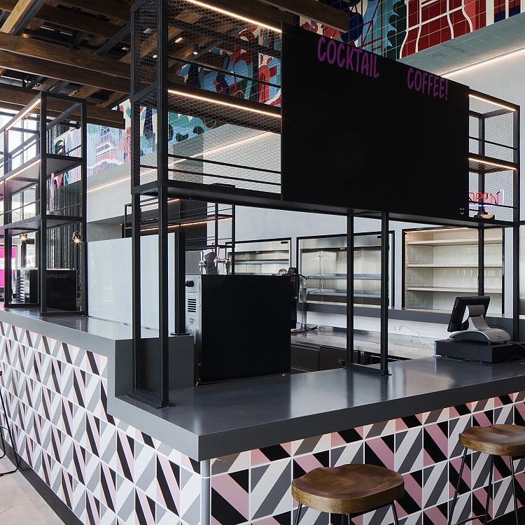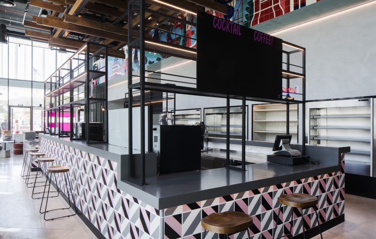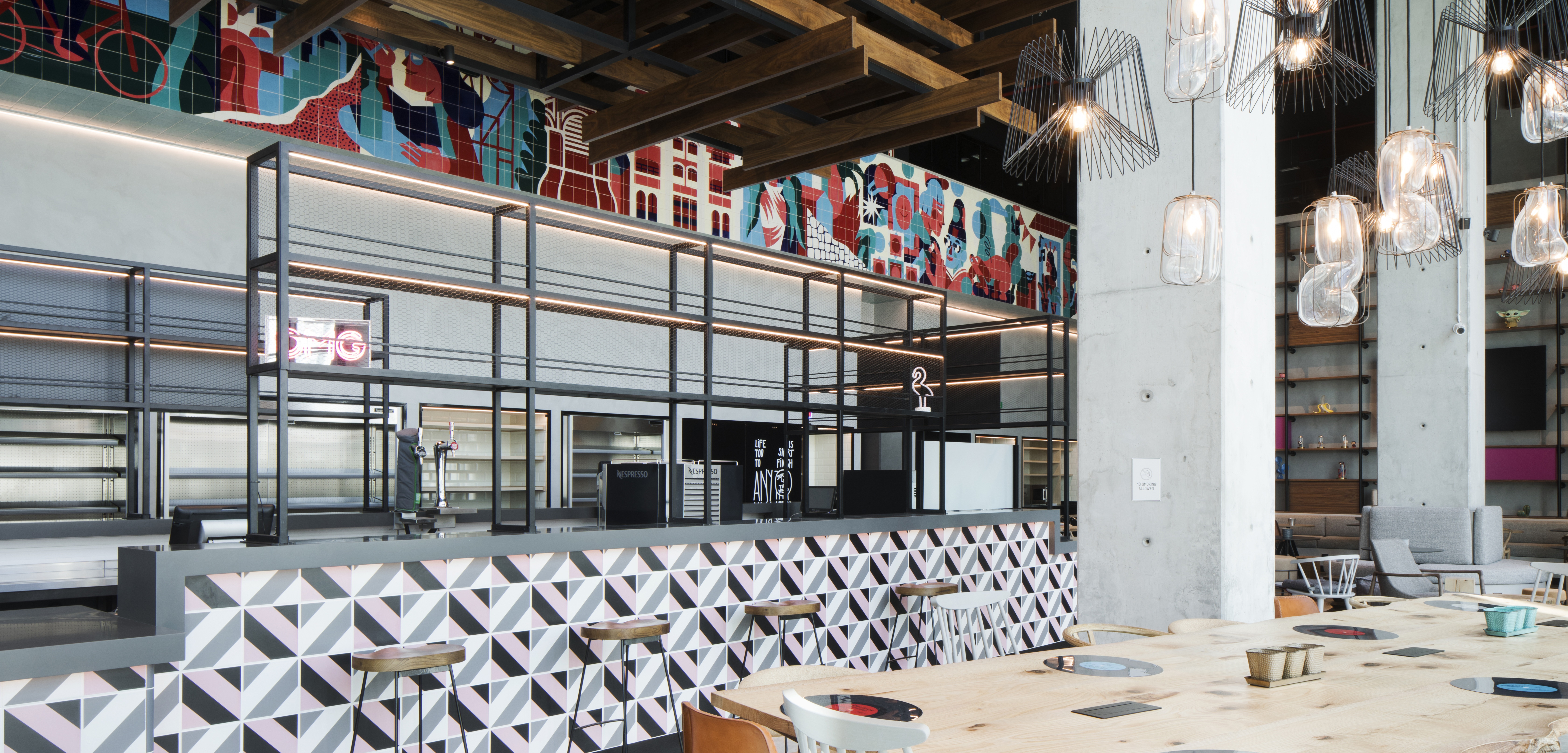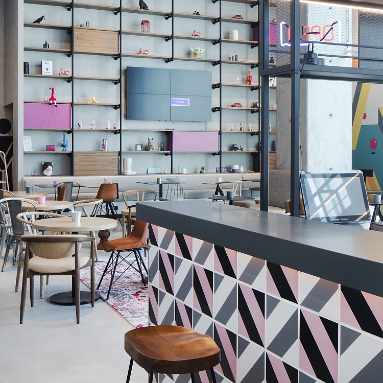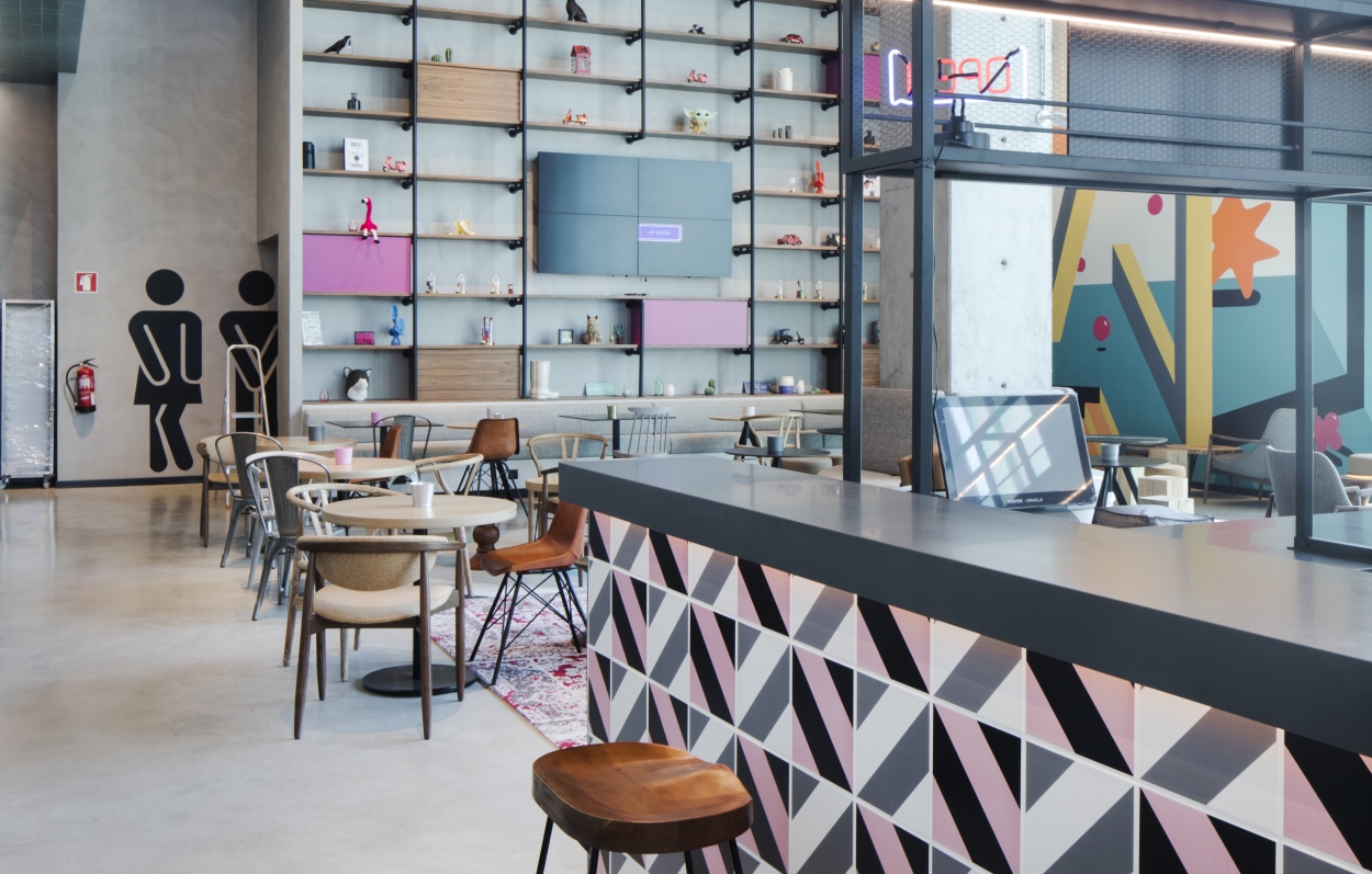 Getreu der Markenphilosophie stand für das innovative Design des Moxy Hotels das perfekte Gästeerlebnis im Vordergrund. Besonderes Augenmerk wurde dabei auf die Lobby gelegt, die das Herzstück des Hotels bilden soll. Der U-förmige Empfangstresen, der gleichzeitig als Bar dient, bietet Steh- und Sitzplätze in unterschiedlich hohen Bereichen. Gestaltet sind sie aus Kacheln mit modernen geometrischen Mustern – eine gelungene Neuinterpretation traditioneller portugiesischer Keramikfliesen. Eine "Hi-Macs"-Platte aus der Solids-Kollektion im Farbton "Marta Grey" bildet den Abschluss des Tresens.