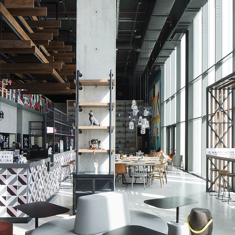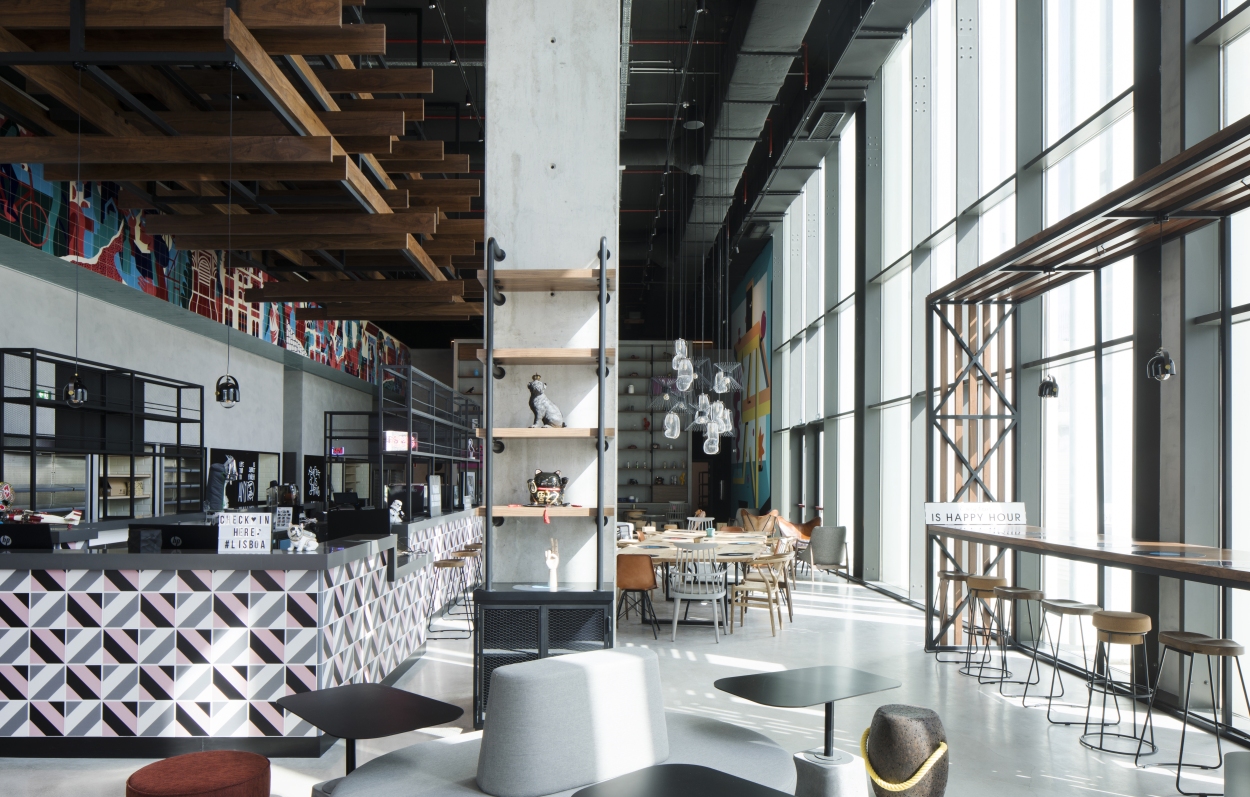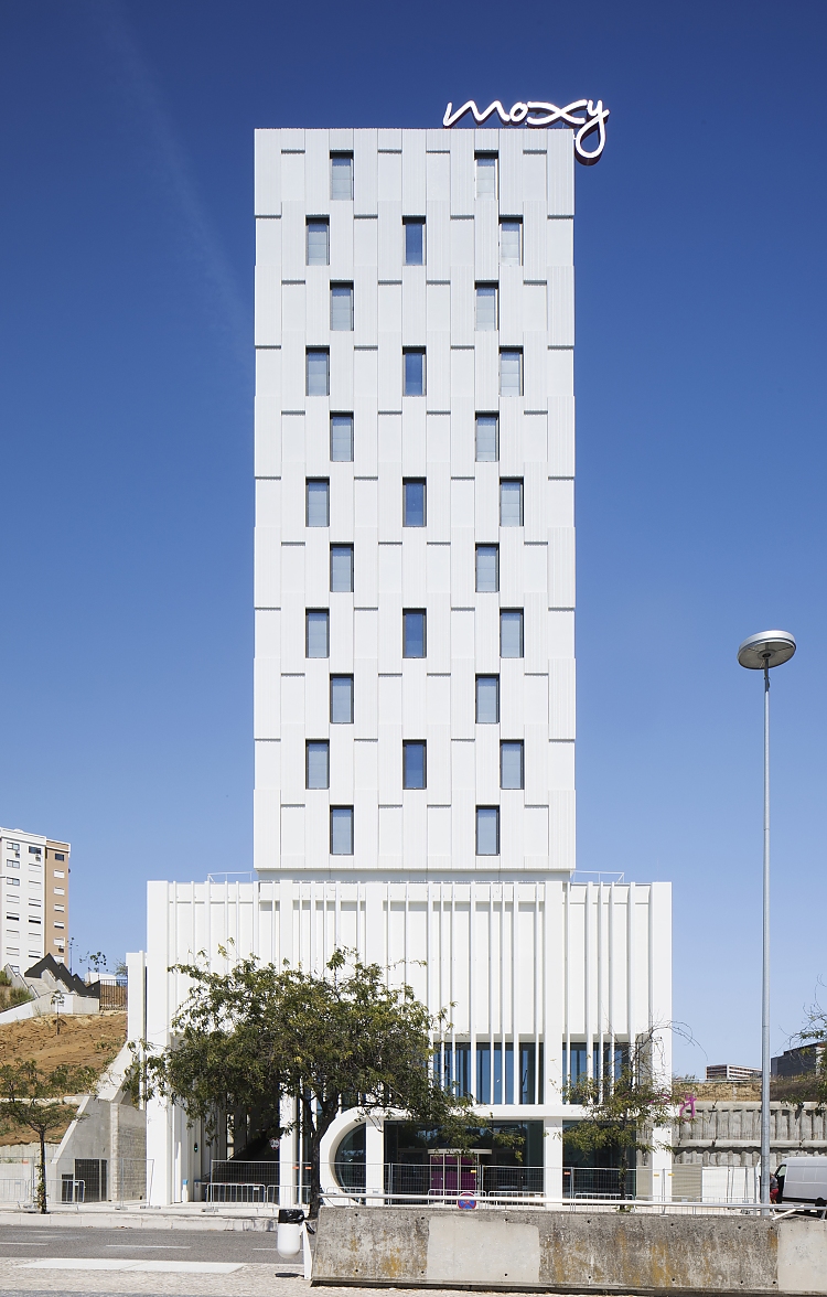 Direkt auf den ersten Blick verspricht das Moxy Hotel in Lissabon lässige Eleganz. So ist das Sockelgeschoss des Hotels mit einer Fassade aus schmalen Säulen verkleidet, hinter der sich sowohl die Lobby als auch das Parkhaus verbergen. Gleichzeitig erzeugt die Konstruktion mit wechselndem Stand der Sonne immer wieder neue Lichteffekte.