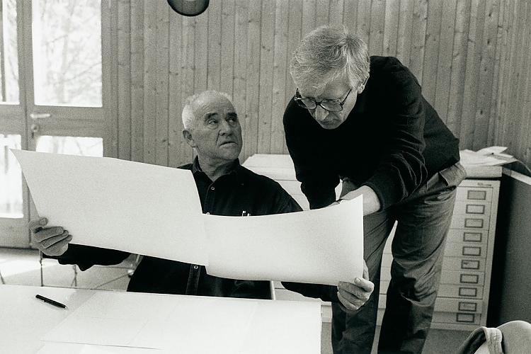 Das Bild zeigt den damaligen FSB-Geschäftsführer Jürgen Werner Braun zusammen mit Otl Aicher (sitzend). Foto: Timm Rautert