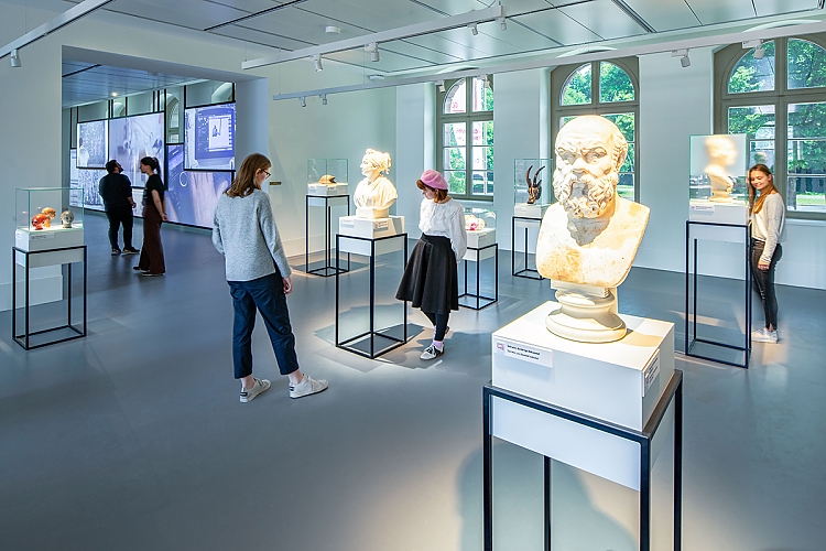 Das Erdgeschoss des Museums stellt das Konzept des Hauses vor. Es dient der Einführung und dem Überblick. Einen Einblick in die Vielfalt der mehr als 40 unterschiedlichen Universitätssammlungen – von Ägyptologie und Astrophysik über Geowissenschaften, Ur- und Frühgeschichte und bis zur Zoologie – eröffnet das "Sammlungsschaufenster". Die begehbare Großvitrine, die exemplarisch, wechselnde Objekte aller Sammlungen zeigt, birgt in ihrer Mitte einen Raum für Studienzwecke. Er steht Mitgliedern der Universität für Seminare, Meetings und zur Erforschung der Exponate offen. Das Vorgehen des "Wissenschaffens", das im Obergeschoss des Museums Raum für Raum erfahrbar wird, zeigt eine Filmcollage im Raum "Praktiken". Der daneben liegende "Freiraum" bietet die Möglichkeit, auf aktuelle Themen zu reagieren und neue Diskurse anzustoßen, beispielsweise mit Sonderausstellungen. Im Obergeschoss entspricht ihm eine leere Vitrine pro Raum, die immer wieder neu bestückt wird, sodass neue Dialoge entstehen können.