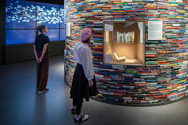 Der letzte Raum des Rundgangs ist die Bibliothek, die als riesiger, begehbarer Turm aus hunderten von Büchern gestaltet ist. Sitzbänke im Innern laden zum Verweilen ein. In der Bibliothek sammelt sich geordnetes, aufbereitetes Wissen. Lexika, Geschichtsbände, Reiseführer, daneben auch der Schelmenroman "Till Eulenspiegel" und profane Ratgeber zur Fettverbrennung. An einer Medienwand erhält der Besuchende Zugang zum digitalen Archiv der Universitätssammlungen. Hier speist er sein individuell gesammeltes Wissen in einen größeren Kontext ein. Wissenschaft wird fortgeschrieben.