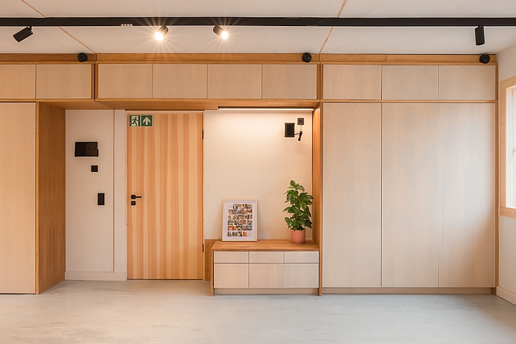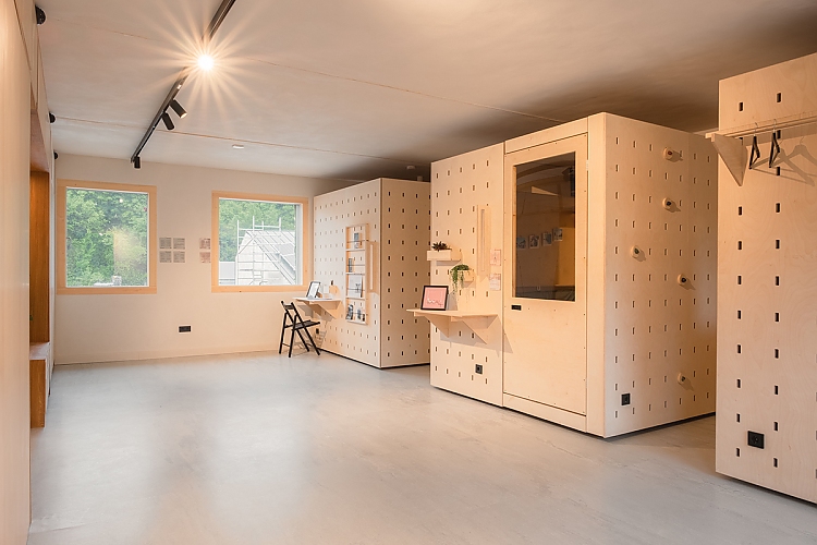 Während sich das gemeinschaftliche Leben in einem perfekt eingerichteten multifunktionalen Raum im Erdgeschoss abspielt, wo gechillt, gekocht, gegessen, gearbeitet oder gefeiert werden kann, finden sich die privaten Rückzugsorte zum Schlafen, ungestörten Arbeiten und zur Körperhygiene in den vier Obergeschossen. Pro Etage bilden jeweils drei Personen eine Wohngemeinschaft. Dort gruppieren sich um eine mit maßgefertigten Funktionsmöbeln ausgestattete "Spielwiese" mehrere Cubes, deren innen und außen perforierte Holzoberflächen als "Packboards" gestaltet wurden. Ganz nach Bedarf nehmen sie unterschiedlichste Elemente vom Regal bis zum Schreibitsch werkzeugfrei auf.