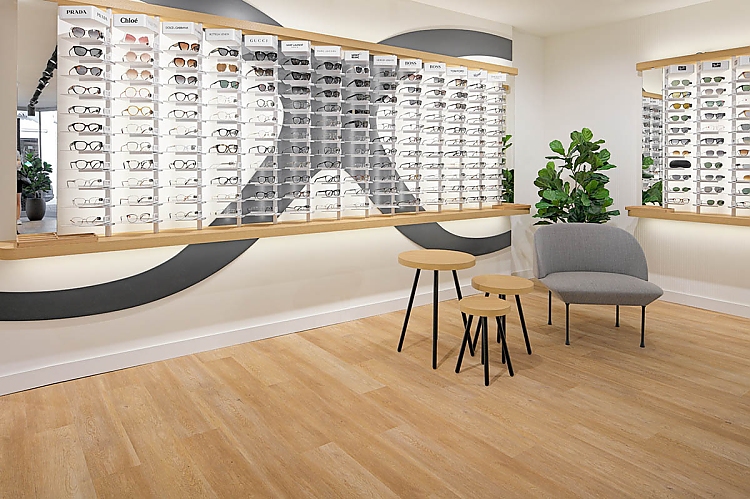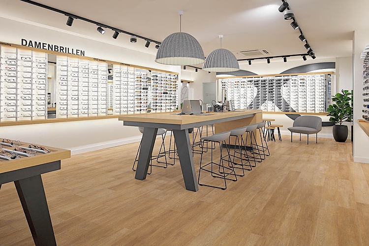 Die im Wesentlichen immer gleich gestalteten Stores haben einen hohen Wiedererkennungswert. Gegenüber dem Eingang blickt den Kund:innen das Logo – die rechts und links angeschnittene Brille – entgegen. Mittig und luftig im Raum verteilt laden große Tische und einzelne kleine Sitzgruppen zum unkomplizierten Platznehmen ein, das Farbkonzept im Skandinavischen Stil lebt von klaren Kontrasten, viel Weiß und Grau und wenigen anthrazitfarbenen Akzenten. Der Boden wurde ebenfalls hell gewählt, greift Holzelemente der Regale, Tischplatten und Sideboards auf und schafft eine wohnliche Atmosphäre. So entsteht ein harmonisches, modernes Umfeld für die Warenpräsentation. Keine schwere Möblierung oder Farbenpracht lenkt ab, das Produkt steht hier im Mittelpunkt.