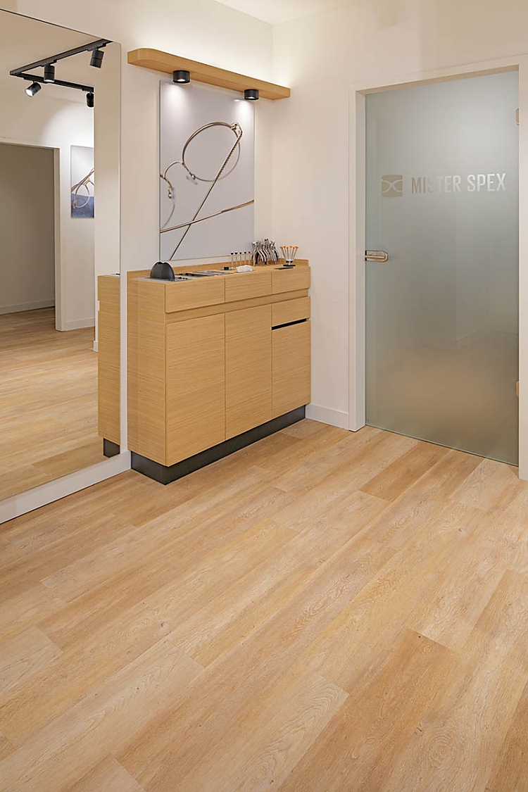 Der Designboden von Project Floors mit dem "Dekor PW 1250" aus der "floors@work"-Kollektion ist fester Bestandteil des Einrichtungskonzeptes und liegt in allen Stores. "Der Boden vermittelt eine stylische und doch gleichzeitig heimelige Holzoptik, fast wie echtes Holz. In unserem Business-Alltag mit hoher Kundenfrequenz hält er so einiges aus. Top!", freut sich auch die Bonner Store Managerin Nicole Vanek.