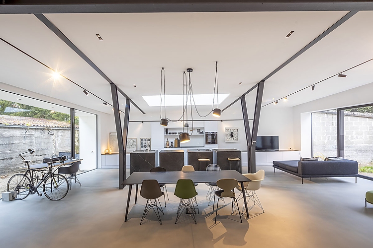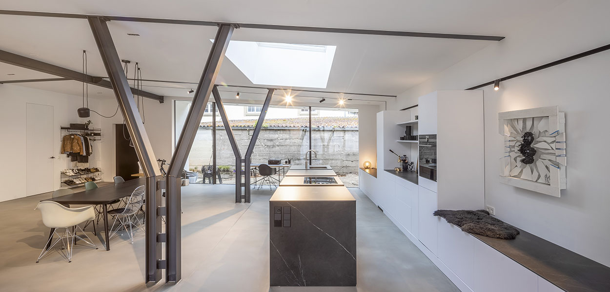 Das in Winnenden ansässige Küchenstudio Negele wurde im Rahmen des diesjährigen Global Kitchen Design Award mit dem ersten Platz ausgezeichnet. Der Blick auf die besonders repräsentative Planung, die in einem Privathaus in Stuttgart realisiert wurde, zeigt par excellence, wie Küche nahtlos in einen maximal geöffneten Wohnraum übergehen kann. Kochen, Wohnen und auch Arbeiten verschmelzen hier zu einer Einheit. Umso entscheidender sind die Details, die im engen Austausch zwischen den Bewohnern, dem Architekten des Hauses und dem Küchenstudio Negele feinfühlig geplant wurden. Küche und Architektur gehen hier Hand in Hand im loftartigen Industriestil. Den Blickfang und das Zentrum bilden die grafisch klar unterteilten Kuben im Keramik-Programm "Kera" von Leicht. Vier Einzelelemente sind mittig zwischen den Stahlträgern der Architektur eingesetzt und passen sich dank des nahezu schwarzen Kalksteins in der Farbe "Iguazu" optisch dem Loft an.