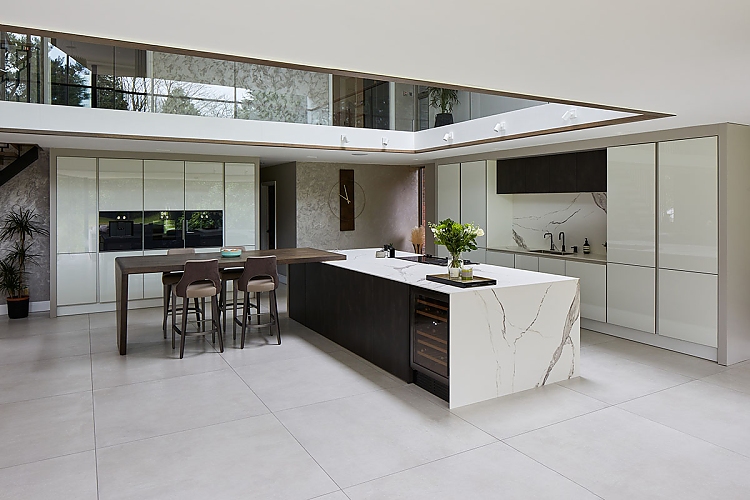 Mit der Zweitplatzierung wurde Reflections Studio für ein Gestaltungsprojekt in Birmingham ausgezeichnet, in dem es um die Küchenplanung innerhalb einer offenen Architektur ging, die mit zahlreichen interessanten Blickachsen, mehreren Ebenen und viel Transparenz durch bodentiefe Fensterfronten eine besondere Herausforderung darstellte. Der Wunsch der Eigentümer war eine einzigartige Statement-Küche, die verschiedene Wohnbereiche in einem neuen Glasanbau miteinander verbindet. „Wir griffen den ursprünglichen Wunsch des Kunden nach Glas auf und fügten mit der sanft strukturierten Leicht-Lackfront "Minera" etwas Dramatik hinzu, um der Küche eine gewisse Atmosphäre zu verleihen", so das Küchenplanungsstudio. "Um dem Glas ein weiteres, natürlich lebendiges Material entgegenzusetzen, ergänzten wir die maßgeschneiderte Frühstücksbar aus Massivholz mit geschwungener Kante – so konnten wir gleichzeitig auch der Linearität der Planung eine weitere Form gegenüberstellen."