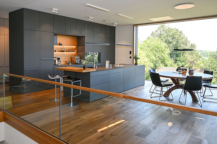 "Auf genügend Stauraum kommt es an! Und wir möchten, dass Leben und Kochen hier bewusst und gemeinsam stattfindet", so lautete der Wunsch des Ehepaars an das Küchenstudio Carola Graul für ihr Wohnprojekt in Neusäß bei Augsburg. Das Resultat ist eine raumübergreifend gedachte Küchenplanung, mit dem das Planungsteam von Carola Graul mit dem dritten Platz des Global Kitchen Design Award prämiert wurde. Der Traum, in Einklang mit der Natur zu leben, wurde in diesem modernen Wohnhaus realisiert – so gewährt jede Perspektive einzigartige Ausblicke in das grüne Umland. Auch aus der offen geplanten, formal klar konzipierten Küche lässt sich die Sicht ins Freie genießen. "Besonders wurde Wert auf nachhaltige, pflegeleichte und haptisch angenehme Materialien gelegt und eine moderne, geradlinige Gesamtoptik war unser Ziel", so das Planungsteam des Küchenstudios Carola Graul.