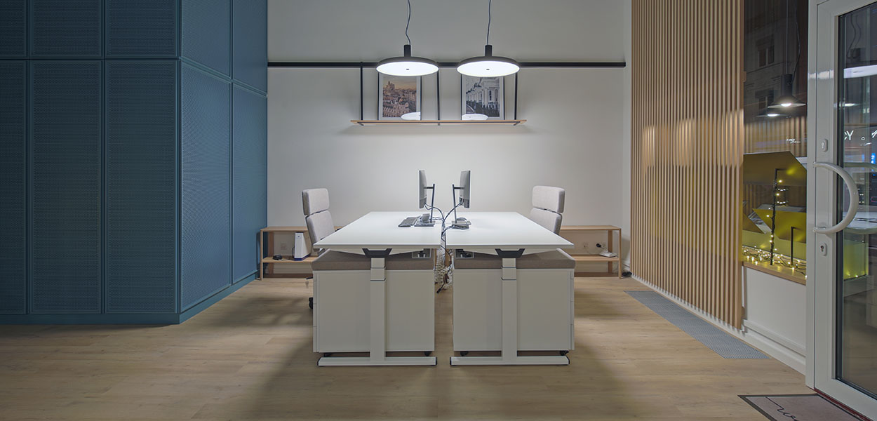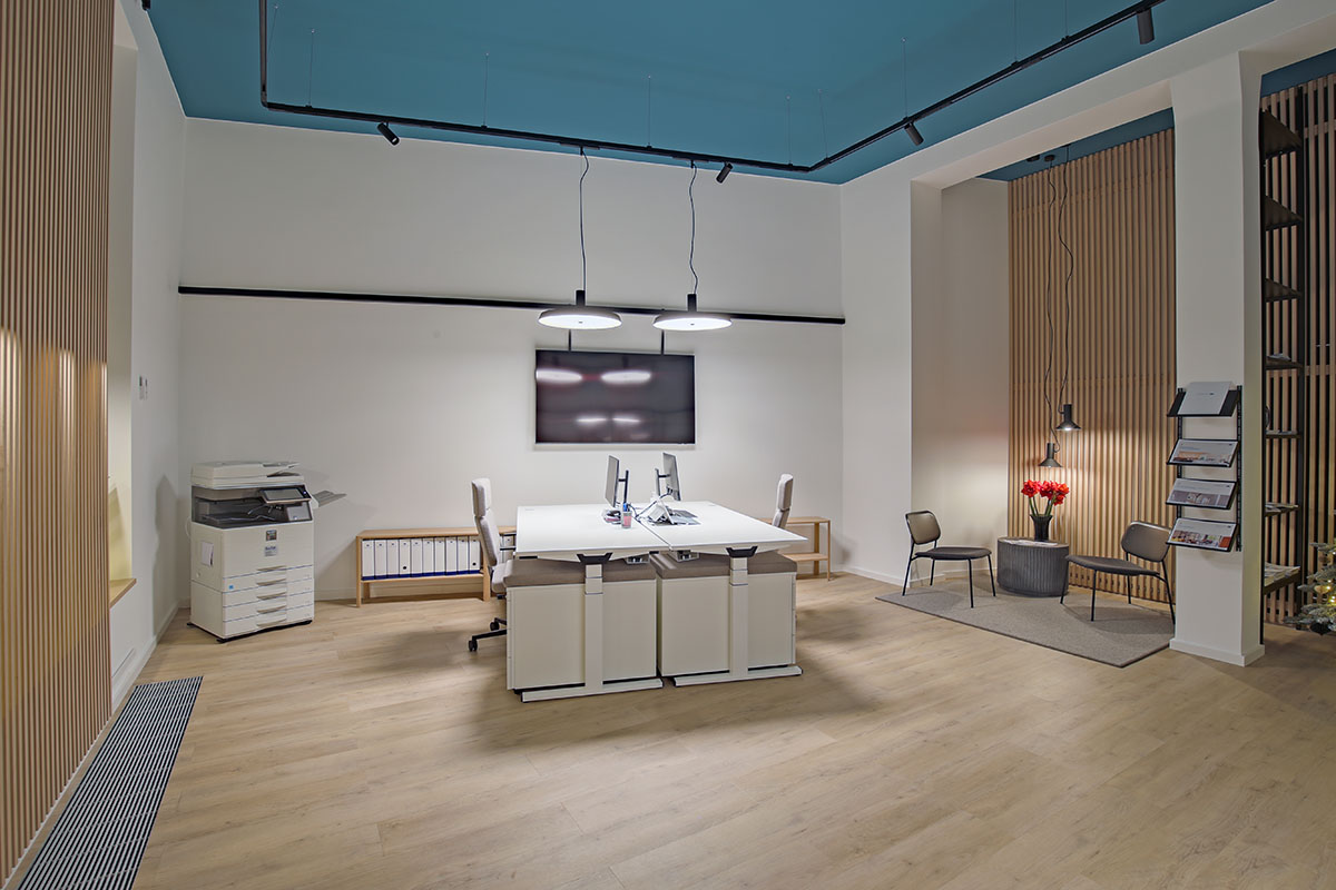 Eine Nische in einem kräftigen Blaugrünton setzt einen klaren Kontrast und dient als Blickfang im Raum. Die Akzentfarbe orientiert sich am Firmenlogo. An die Nische schließt sich eine kleine Sitzecke an. Diese ist mit atmosphärischer Beleuchtung und Holzlamellen als gemütlicher Verweilbereich für wartende Kunden und Mitarbeiter gestaltet.