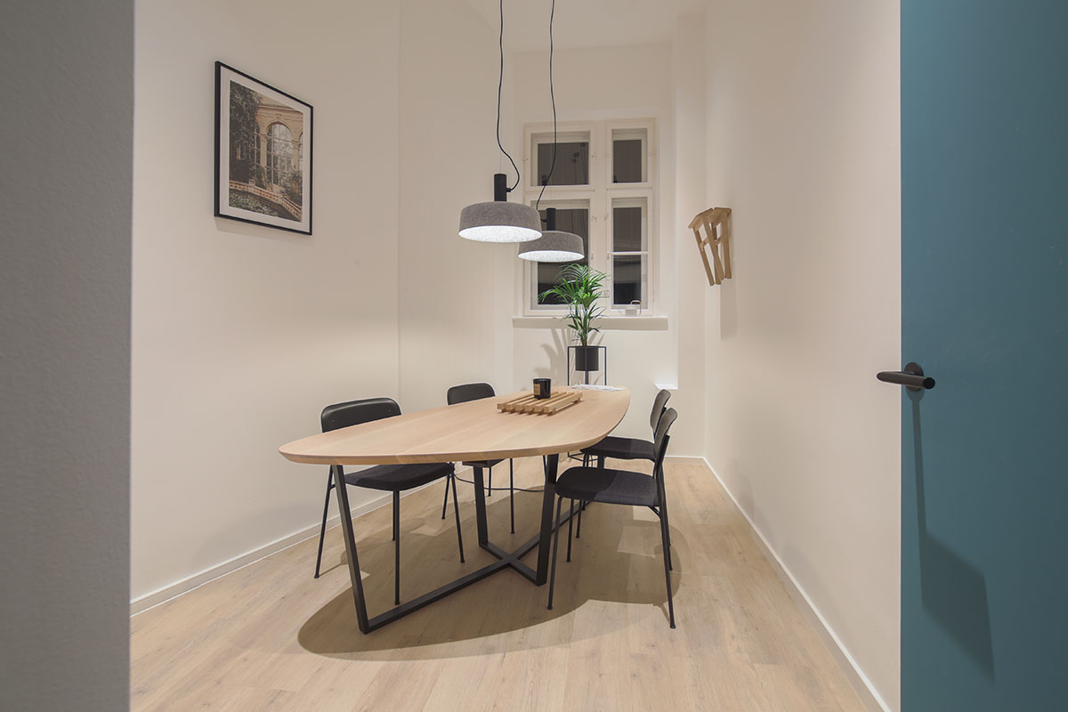 Abgegrenzt vom offenen Büro befinden sich in den hinteren Räumen zudem die Küche und ein Konferenzraum.