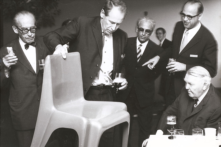 Das Zusammenspiel von Design und Wirtschaft wurde von Anfang an gefördert: Philipp Rosenthal präsentiert den Preisträger des Rosenthal-Studio-Preises 1966 für den Bofinger-Stuhl von Helmut Bätzner. Links zu sehen ist Walter Gropius, am rechten Bildrand Ludwig Erhard. Fotografie: Rosenthal. Quelle: Archiv Beate Reichel.