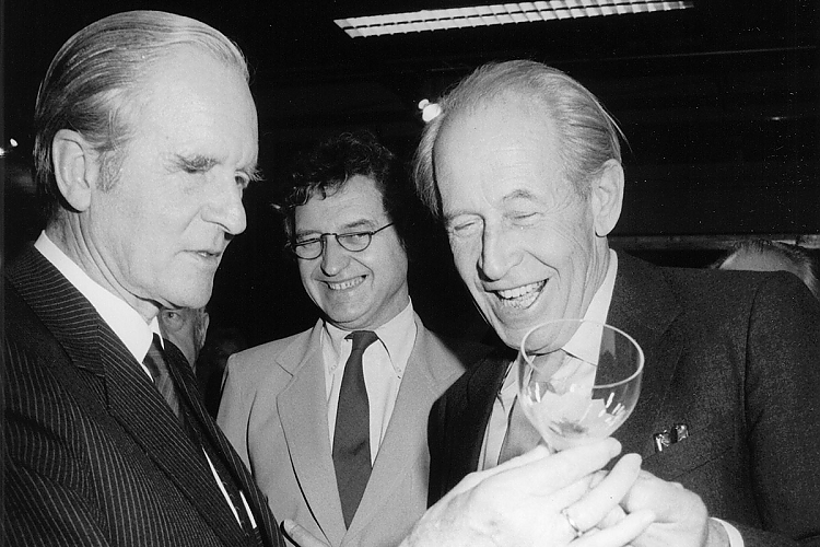 Bundespräsident Dr. Karl Carstens im Gespräch mit dem Präsidenten des Rat für Formgebung Philip Rosenthal während der Präsentation der ausgezeichneten Produkte des Bundespreis "Gute Form“ 1982 im Internationalen Design Zentrum (IDZ) Berlin. Im Hintergrund ist Herbert Ohl, der Fachliche Leiter des Rat für Formgebung, zu sehen. Foto: Foto Kessler, Berlin / Archiv des Rat für Formgebung