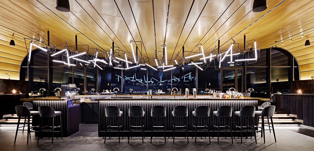 Der Bartresen in "Otto’s Skybar“ (19. Etage des Lindner Congress Hotel Düsseldorf) zieht mit einer von Geplan Design entworfenen, gewitterwolkenartigen Lichtinstallation alle Blicke auf sich. Fotos: Nicole Zimmermann Fotodesign