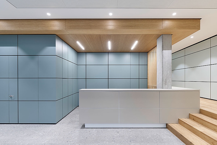 Gleichzeitig ermöglicht das Konzept die Nutzung der Besprechungs- und Kommunikationsflächen durch einen Co-Working-Space, für den eine eigene Untermietsfläche geschaffen wurde. Das gemeinschaftliche Nutzungskonzept schafft Impulse für ein lebendiges und innovatives Arbeitsumfeld. Der Wunsch nach einer barrierefreien Zugänglichkeit machte sensible Eingriffe in Rohbau und Fassade notwendig. Hieraus entstand eine neue Eingangssituation, die klare Orientierung bietet. Betritt man das Gebäude zukünftig durch die großzügige Windfangsituation, präsentiert sich das neue Headquarter in einem fein abgestimmten Mix aus natürlichen Materialien und gedeckten Farben.