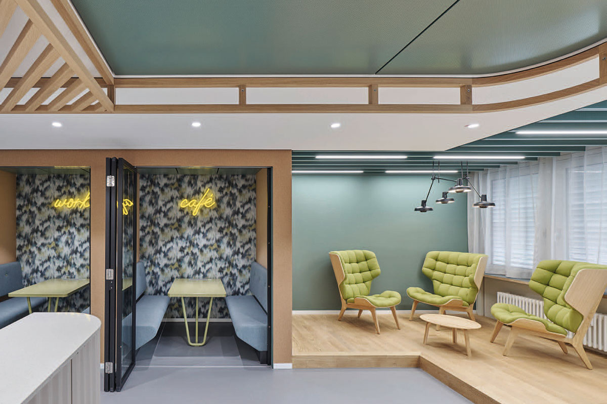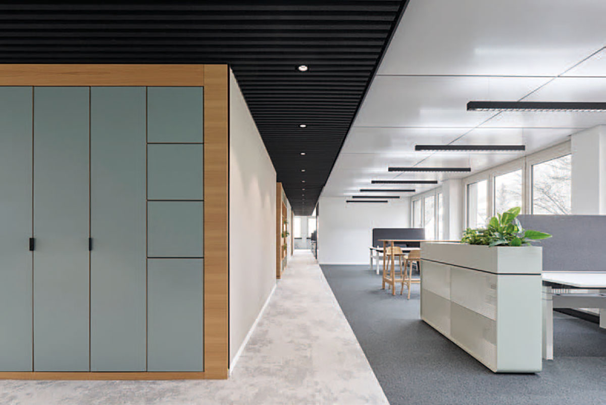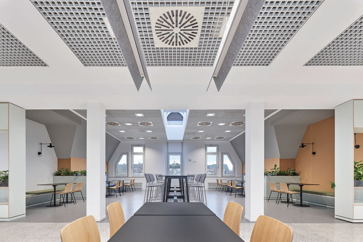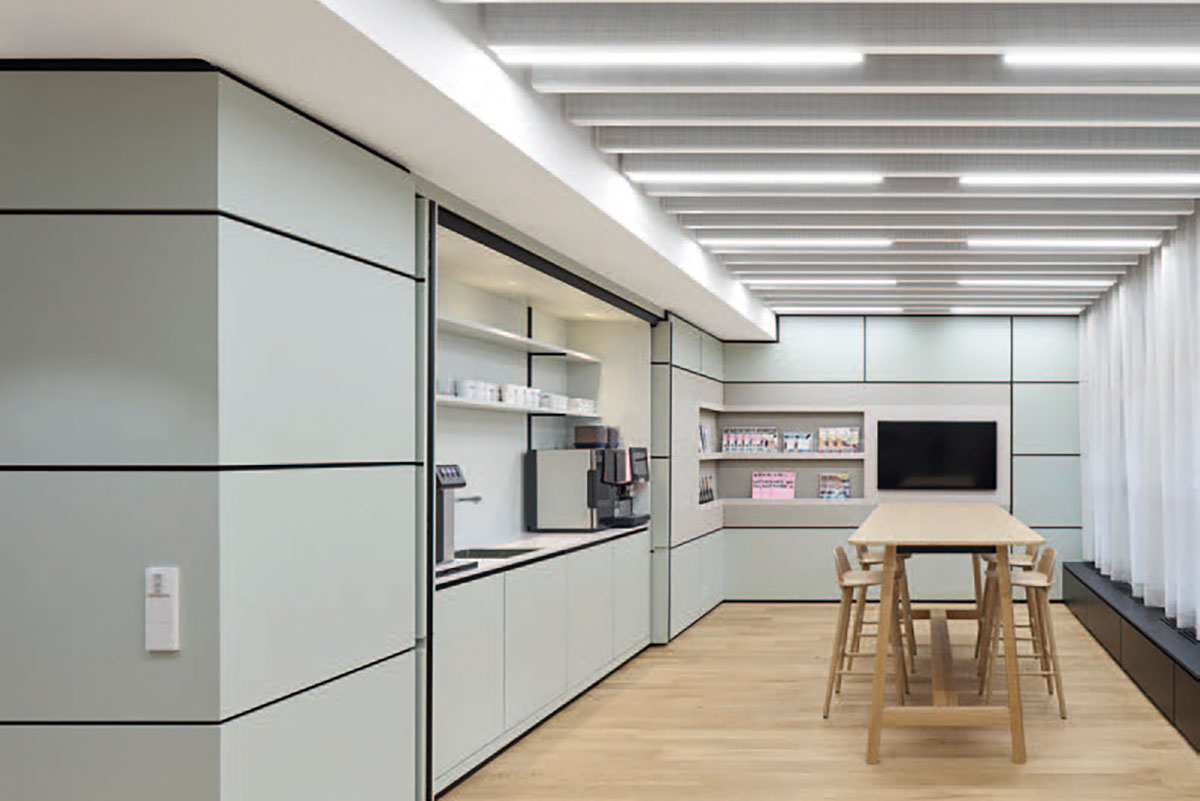 Prägnante Grafiken greifen die genossenschaftlichen Ideale der Flüwo auf, leiten durch das Gebäude und schaffen Identifikationspunkte im Raum. Im Zuge der Sanierung wurde neben der Neugestaltung der Flächen auch ein integratives Technikkonzept realisiert, das mit einem intelligenten Akustik-, Beleuchtungs- und Klimatisierungskonzept ideale Rahmenbedingungen für ein angenehmes Arbeitsklima schafft.