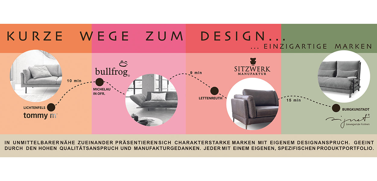 Vier Polstermöbelhersteller aus Oberfranken laden vom vom 24. bis 27. September 2023 gemeinsam in ihre jeweiligen Showrooms ein. Unter dem Motto "Kurze Wege zum Design" präsentieren die Marken Bullfrog, Signet, Sitzwerk Manufaktur und Tommy M charakterstarke Ideen rund um das gepolsterte Möbel. Die Ausstellungsflächen der oberfränkischen Markenhersteller liegen nur wenige Kilometer voneinander entfernt.