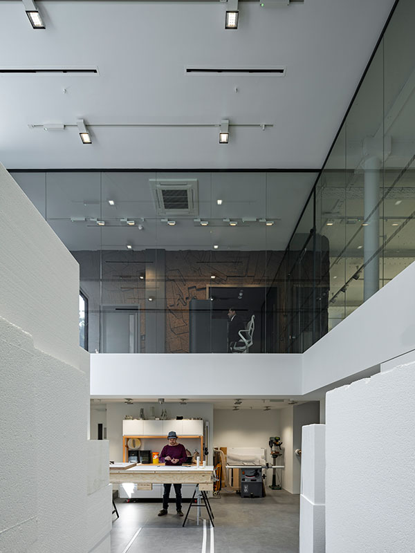 Die Erd- und Untergeschosse kombinieren Ausstellungsräume und Räume für Designforschung und digitale Produktion, die es ZHA ermöglichen, verschiedene Präsentationen architektonischer Innovationen zu zeigen. In diesen Stockwerken lassen sich außerdem weitere publikumswirksame Aktivitäten durchführen, von inoffiziellen Abendessen und Cocktailempfängen bis hin zu Workshops und Podiumsdiskussionen. Die "Parscan"-48-V-Strahler von Erco erlauben es ZHA, verschiedene Bereiche je nach Nutzungszweck zu betonen. "Wir können einen Raum auf verschiedene Weise darstellen." erklärt Melodie Leung, Associate Director bei ZHA. "Manchmal möchten wir, dass ein Raum als weites und einheitliches Ganzes erscheint, und manchmal soll er eher dramatisch wirken."