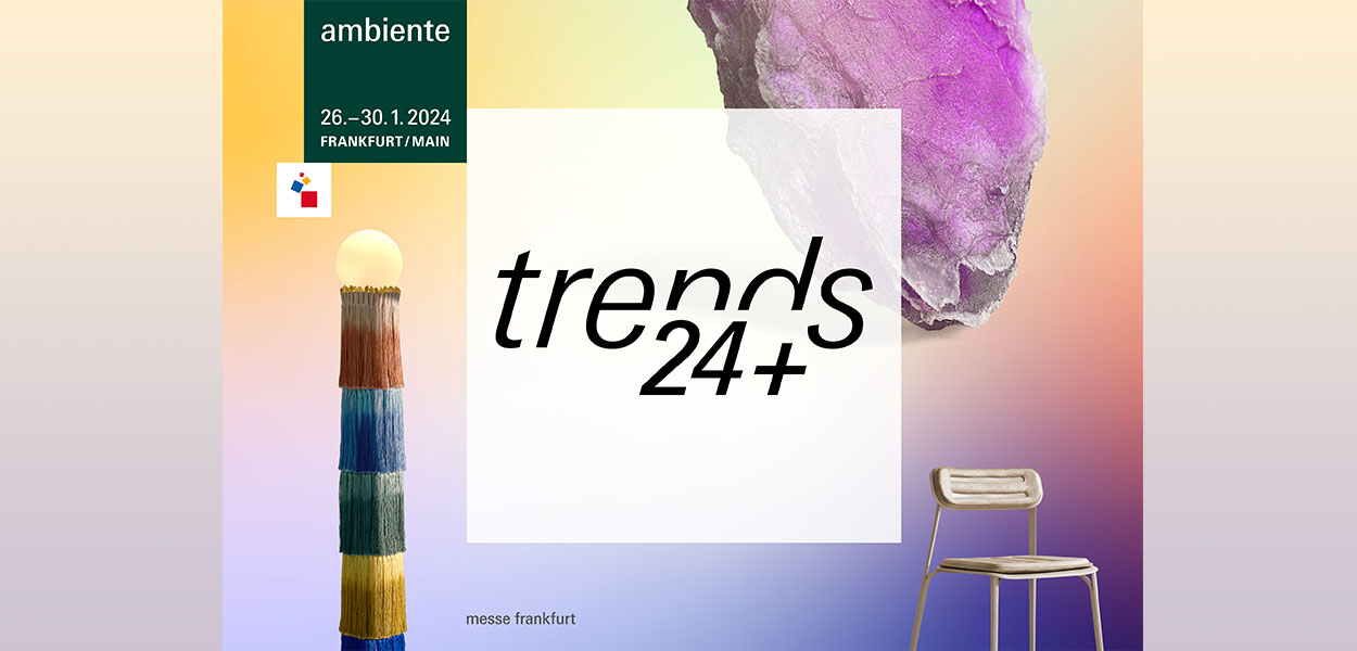 Die Ambiente bildet die entscheidenden internationalen Stilrichtungen im Konsumgüterbereich ab. Ob Dining, Living, Giving oder Working – sie zeigt, was zukünftig auf den Tisch kommt, in Wohn- und Arbeitsräume gehört und gerne verschenkt wird. Hierfür recherchiert das Stilbüro bora.herke.palmisano im Auftrag der Messe Frankfurt weltweit die Formen, Farben und Materialien, die Verbraucher begeistern werden. Die drei wichtigsten Trends werden vom 26. bis 30. Januar 2024 im Trendareal im Foyer der Halle 4.1 mit Ausstellerprodukten in Szene gesetzt.