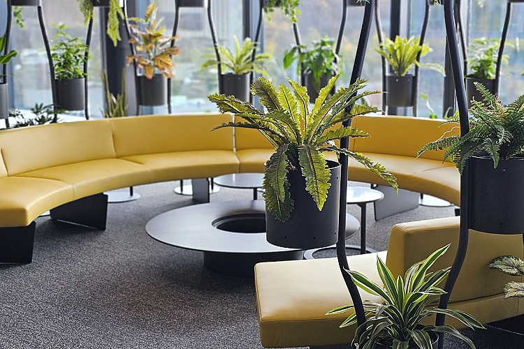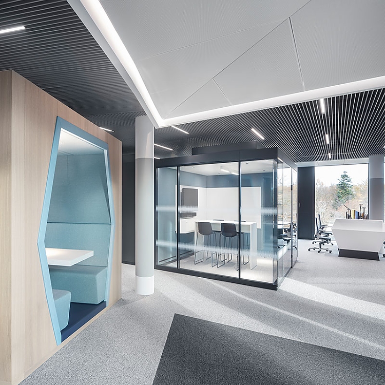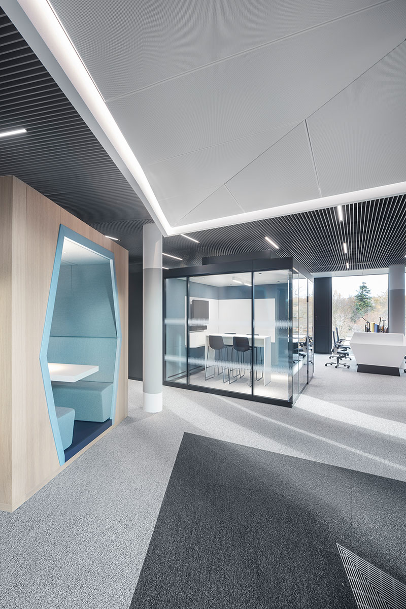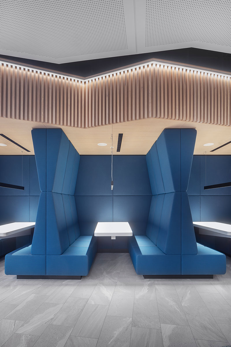 Um möglichst flexibel auf die Anforderungen in den einzelnen Abteilungen und Bereichen reagieren zu können, wurde ein eigenes Raum-im-Raum-System entwickelt. Die Modul-Boxen gibt es in verschiedenen Konfigurationen in unterschiedlichen Größen und Ausstattung – von der Telefonbox bis zum großen Besprechungsraum. Egal, welche Funktion gerade bedient wird: Alle Boxen bieten einen hohen Schallschutz nach außen und eine geräuschlose Lüftung nach innen und sorgen so für hervorragende Arbeitsbedingungen. Den Modul-Kanon komplettieren Alkoven, Sitznischen, Arenen und verschiedene Lounges.