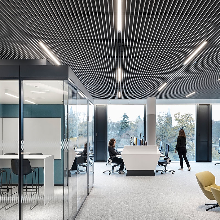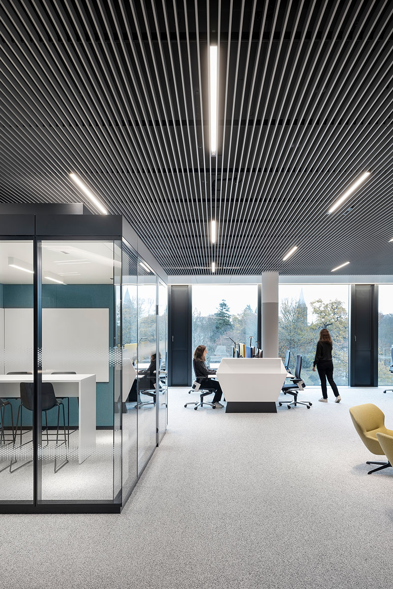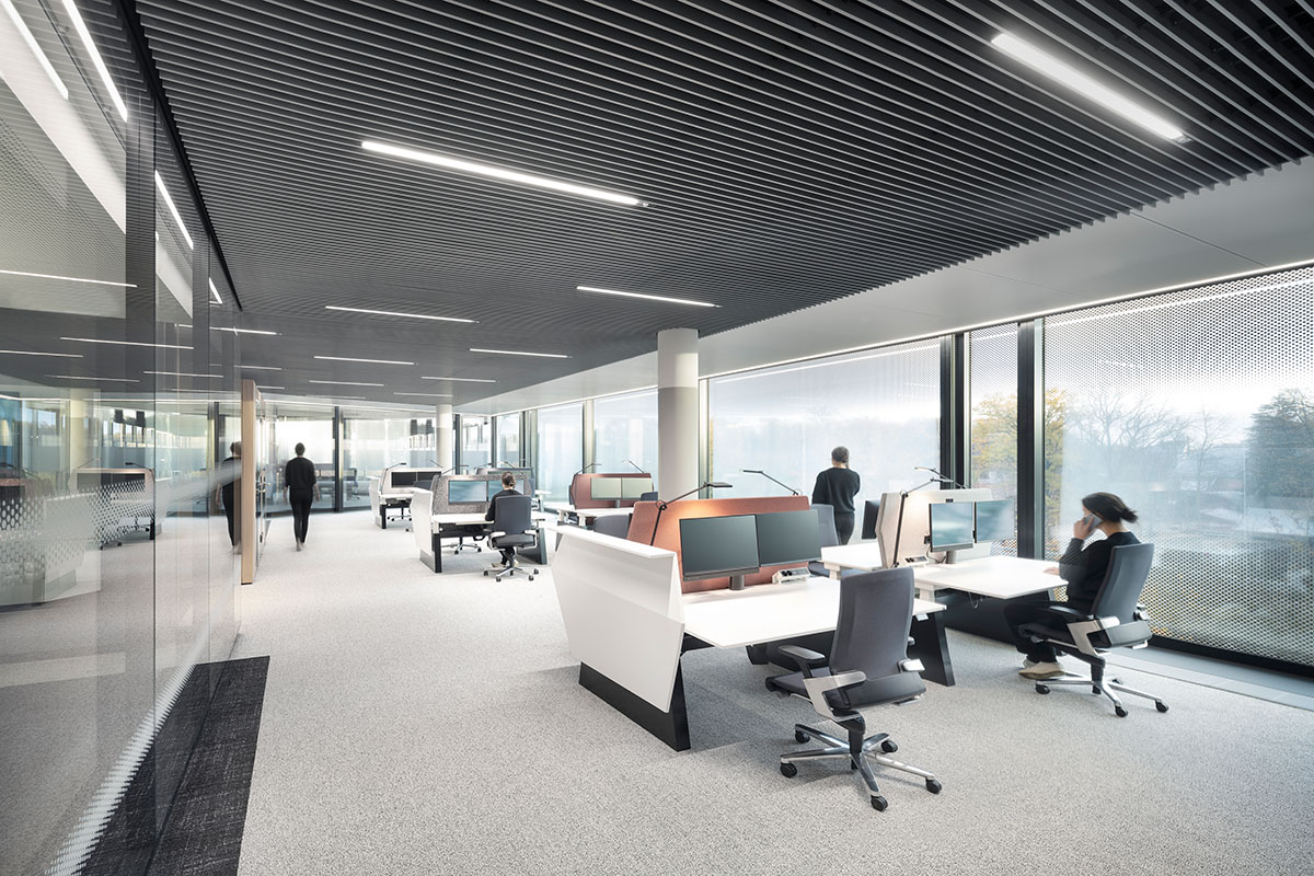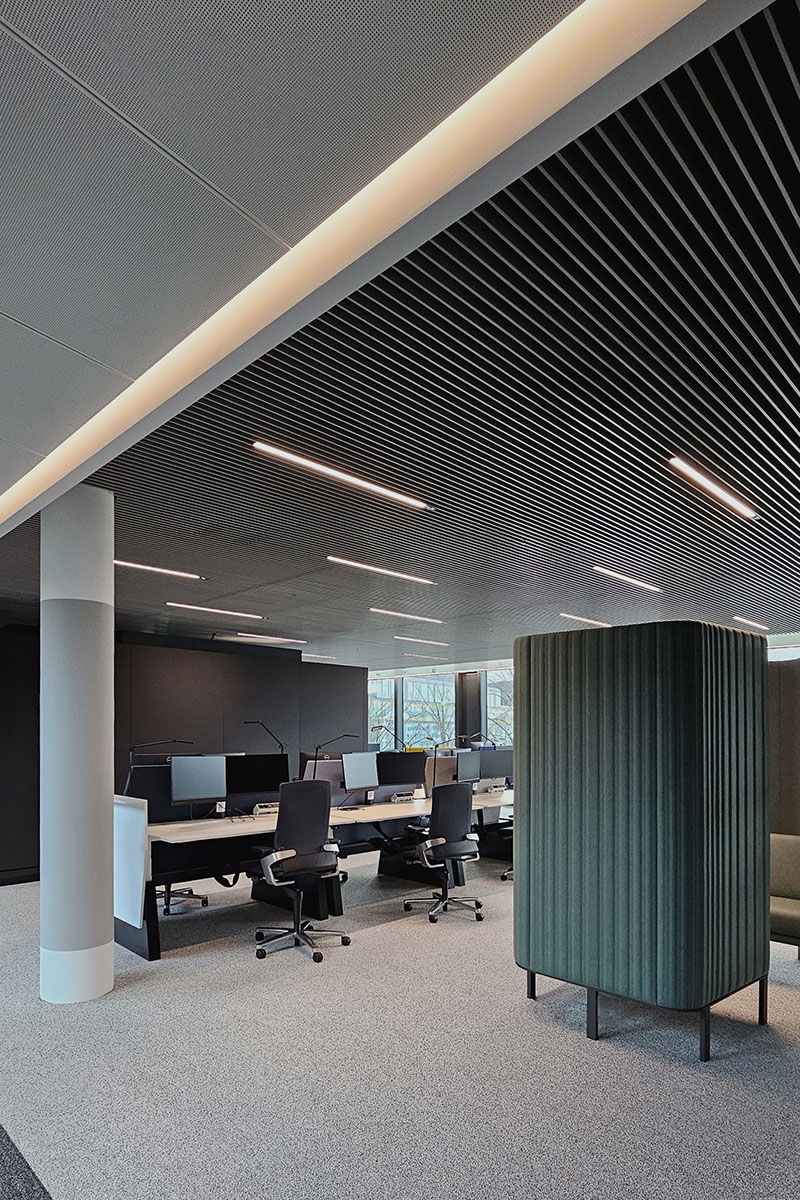 Die zentralen Wege entlang der Fassade rahmen dunkle Teppichflächen und eine von einer Licht-Voute begleitete, abgeschrägte Decke, die für klare Orientierung sorgen. Filterelemente und Blenden an den Schreibtischen bilden eine Pufferzone in Richtung der Arbeitsbereiche. Die Tischaufsätze sorgen für Diskretion, sind mit ihren Ablageflächen aber gleichzeitig Ankommenspunkte und eine Einladung zur Kommunikation.