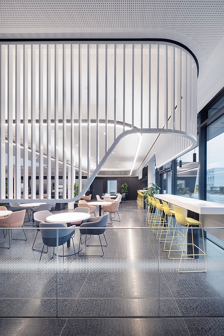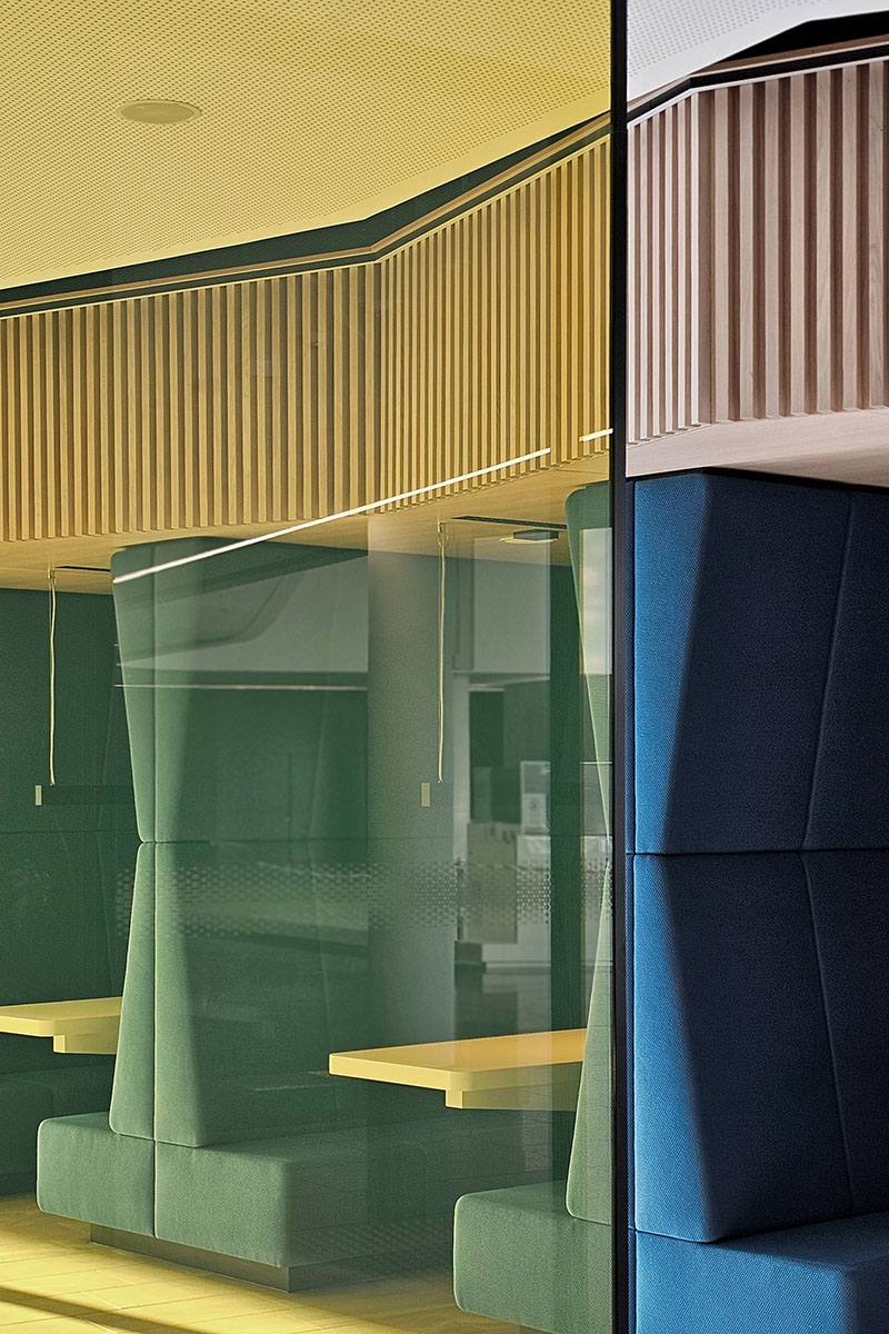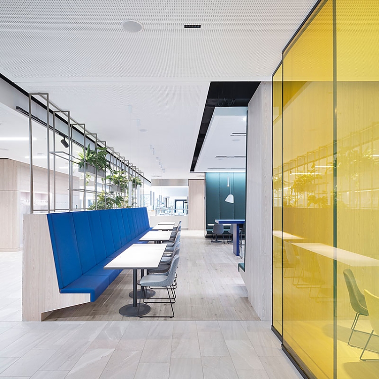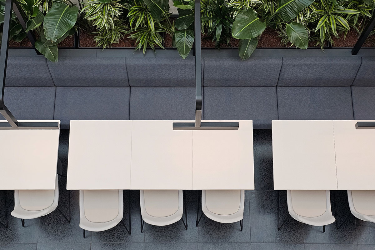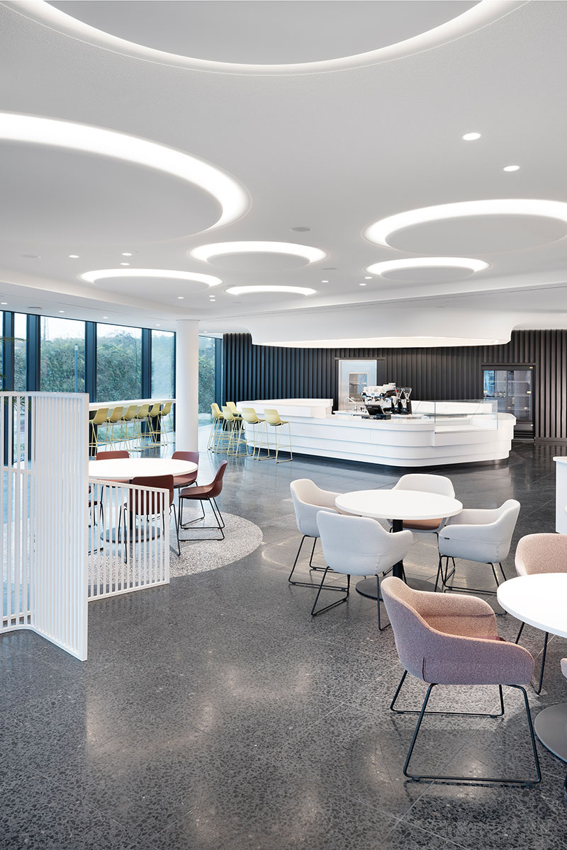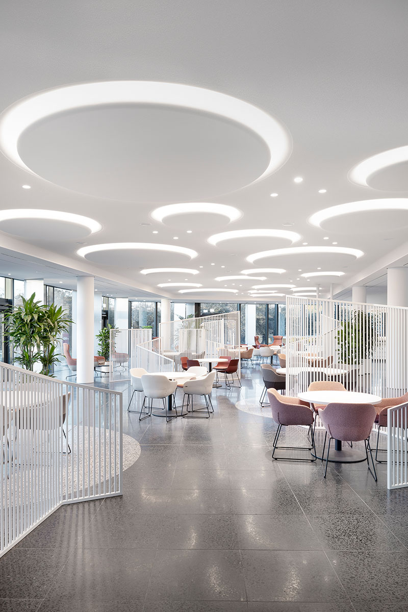 Wo Kaffee ist, wird auch gesprochen. Und Kommunikation ist – siehe oben – auch ein Innovationstreiber. Demensprechend wurde das Restaurant wie auch die Cafeterien in den beiden Gebäudeteilen als hybride Orte gestaltet. Hier finden die Mitarbeitenden nicht nur während der Pausenzeiten den passenden Platz, sondern das differenzierte Sitzplatzangebot empfiehlt sich auch als Abwechslung zum eigenen Schreibtisch. Ob auf dem hochgepolsterten Abteilsitz im Restaurant oder auf einem Platz direkt im Trubel des Atriums, ob mittendrin, ob versteckt in einem Alkoven oder nur leicht geschützt hinter durchlässigen Lamellen – jeder sucht und findet seinen kreativen Moment an einem anderen Ort. Im Restaurant erlauben außerdem mobile Trennwände, eine unterschiedliche Aufteilung der Fläche, von groß für Events bis klein für den Restaurantbetrieb.