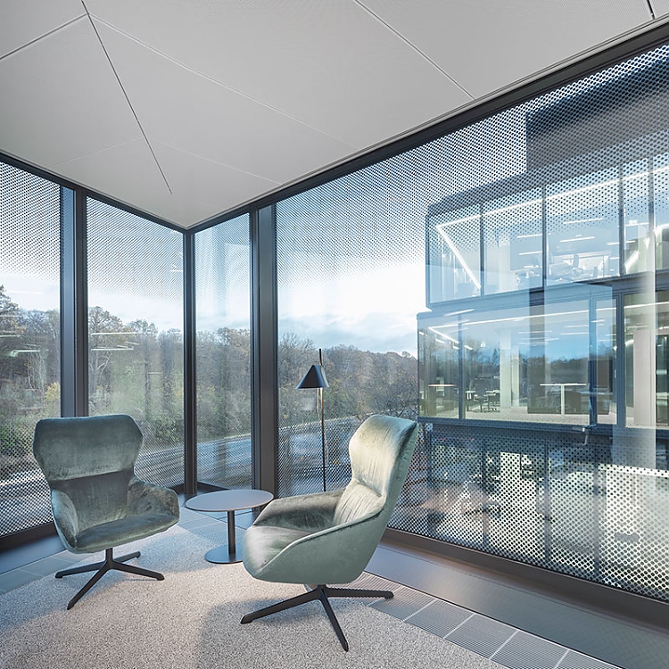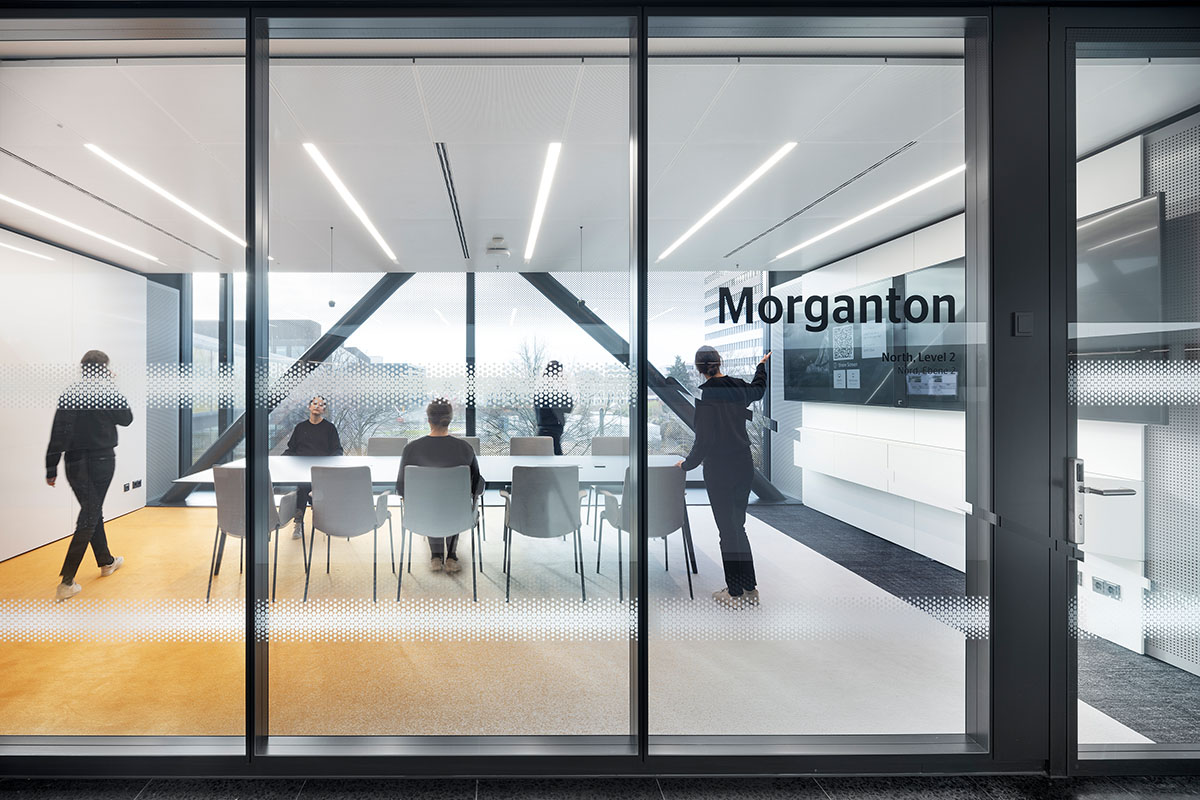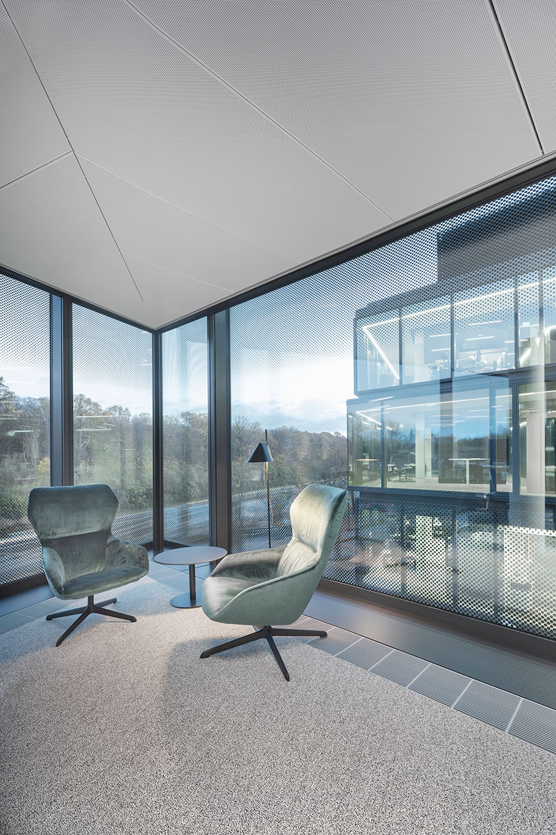 Zukunftsfähig ist auch der Nachhaltigkeitsanspruch von Continental, die mit dem Campus "DGNB Platin"-Status anstreben. So kommen vegane Leder, ein Produkt von Continental, zum Einsatz und die thermische Bauteilaktivierung der Decke sorgt für beste Energieeffizienz.