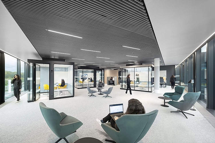 So entfaltet sich eine Landschaft aus unterschiedlichen Arbeitsplatztypologien: von dynamischen Orten des Austauschs und der Begegnung hin zu Orten der konzentrierten Arbeit und des Rückzugs. Die einzelnen Inseln halten großzügig Abstand zu ihren Nachbarn, so dass sich immer wieder neue und überraschende Sichtachsen bis nach draußen ergeben. Die Wege sind so ausgerichtet, dass sie immer auf ein Ziel zuführen, sei es ein Kommunikationsspot oder ein Ausblick in die Natur.