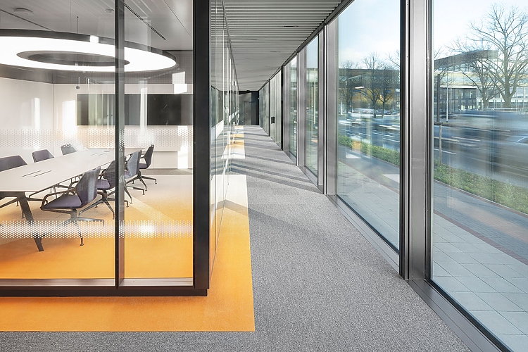 Visuelle Brücken entstehen auch an den Besprechungsräumen, deren Böden häufig aus dem Inneren in die Wegebereiche überlappen. Viele Teppichböden sind dabei als gelb-oranger Farbverlauf ausgeführt – ein Bild mit einer hohen Dynamik und gleichzeitig ein Beispiel, wie mit der CI-Farbe von Continental farbliche Akzente gesetzt wurden. Die Markenbotschaft wirkt hier nicht plakativ, sondern punktuell und damit umso intensiver.