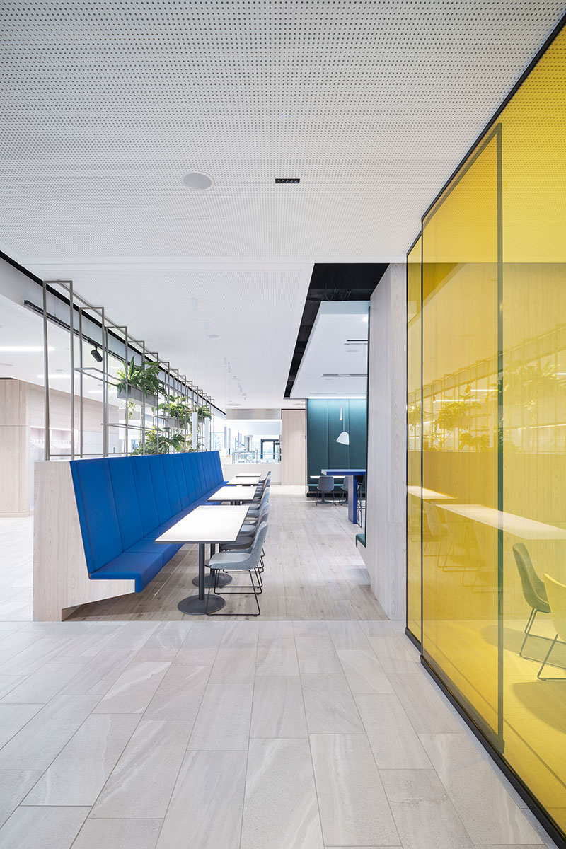 Diese Module und die eigentlichen Arbeitstische wurden auf den einzelnen Ebenen zu immer neuen Landschaften organisiert, die keinem festen Raster folgen, sondern auf die jeweiligen Anforderungen abgestimmt werden. Statt serieller Tischreihen entstehen Communities in kompakten Raumabschnitten, die mit ihren Nachbarn in Beziehung treten.