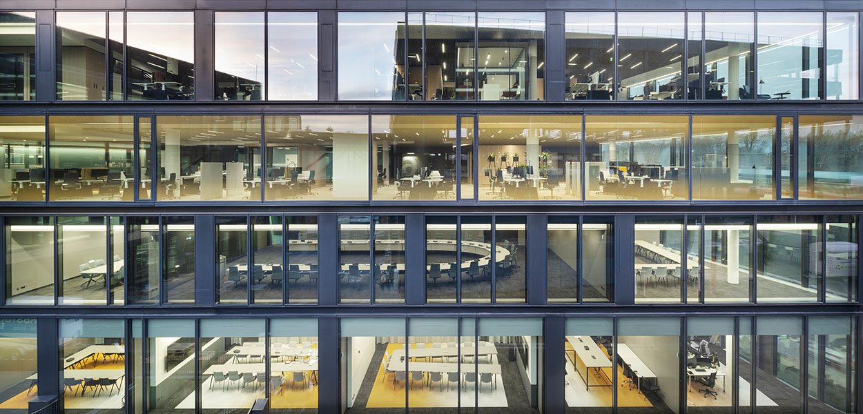 Zahlen und Fakten: Office area open spaces: 10.200 qm, 1.200 desks, Meeting rooms: 3.155 qm, 60 units, 612 seats, Restaurant: 920 qm, 300 seats, Cafeteria Nord: 450 qm, 72 seats inside, 49 seats outside, Cafeteria Süd: 280 qm, 93 seats