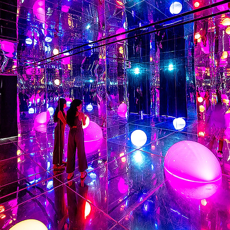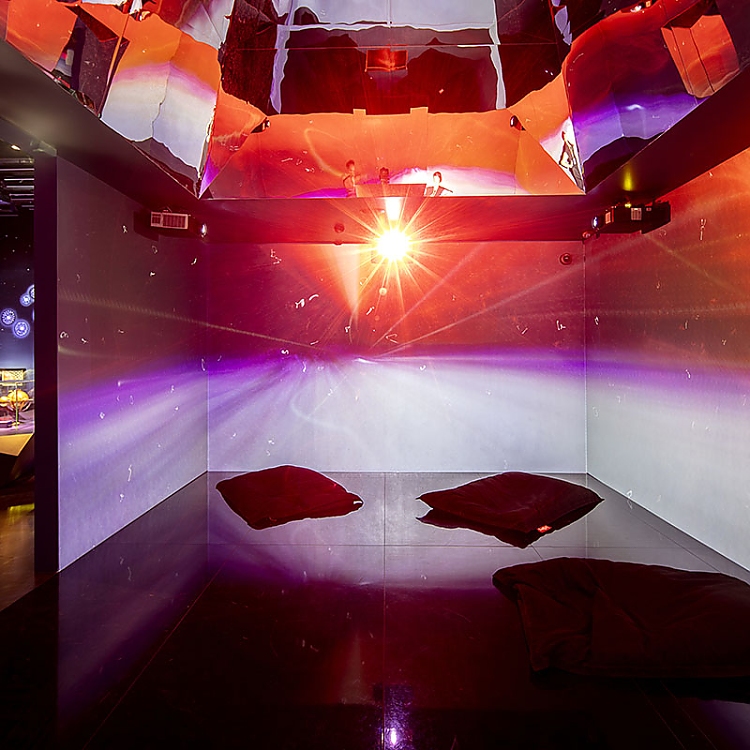 Futuristisch wirkende Ferngläser richten die jungen Museumsbesucher und -besucherinnen auf Himmelskörper und Sternbilder, die auf die umliegenden Wände projiziert sind – auch ein Flugzeug und Sternschnuppen sind darunter. Die Informationen am Display stillen den Wissensdurst. Im Zentrum des Raumes lädt schließlich eine Black Box zum immersiven Erlebnis ein: Projizierte Sterne, Planeten und die Milchstraße, mehrfach gespiegelt, vermitteln ein Gefühl von Unendlichkeit.