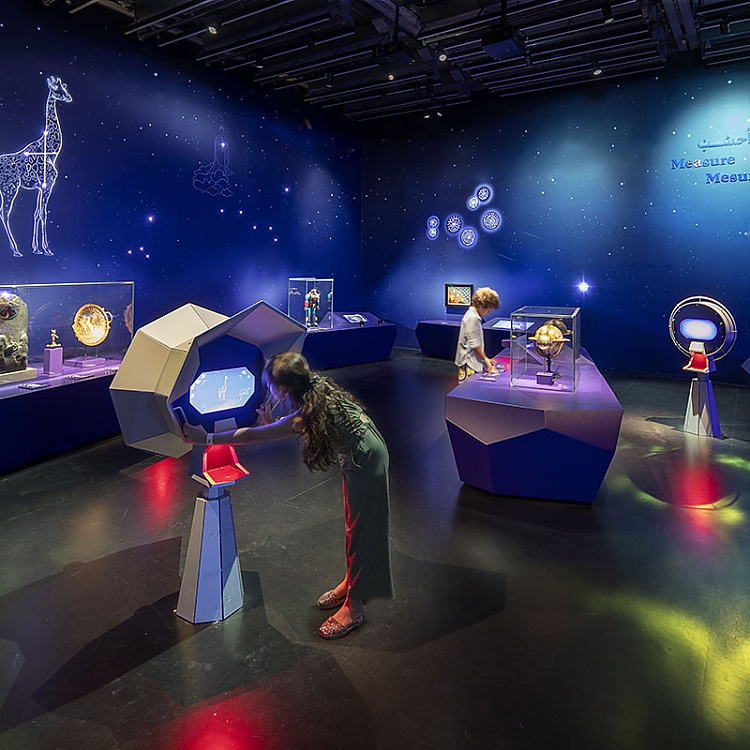 Die interaktive Reise "Picturing the Cosmos“ startet im Erdgeschoss des Louvre Abu Dhabi Kindermuseums. In der "Cosmos Gallery“ dreht sich alles um den Blick des Menschen zum Himmel. Contemplate, Narrate, Measure sind die drei Zugänge, mit denen sich der Mensch den Kosmos aneignet. Die ausgestellten Objekte verdeutlichen dies. Zu sehen sind Messinstrumente, darunter ein Astrolabium (Nordafrika, 1726/27) und ein Sextant (Europa, 19. Jahrhundert) sowie Kunstwerke: eine ägyptische Stele mit Sternenhimmel, rund 2200 Jahre alt, und eine hellenistische Terrakottaschale, die einen Sonnenwagen zeigt – beides Leihgaben aus dem Louvre Paris. Aus der Bibliothèque National de France stammt ein Himmelsglobus, datiert 1750. Seine Sternbilder erkunden die Kinder an einer Medienstation. Die Objektlabel sind je nach Themenbereich unterschiedlich gestaltet. Sie öffnen sich wie Türchen zu einer anderen Welt, lassen sich aufschieben oder aufblättern wie ein Buch.