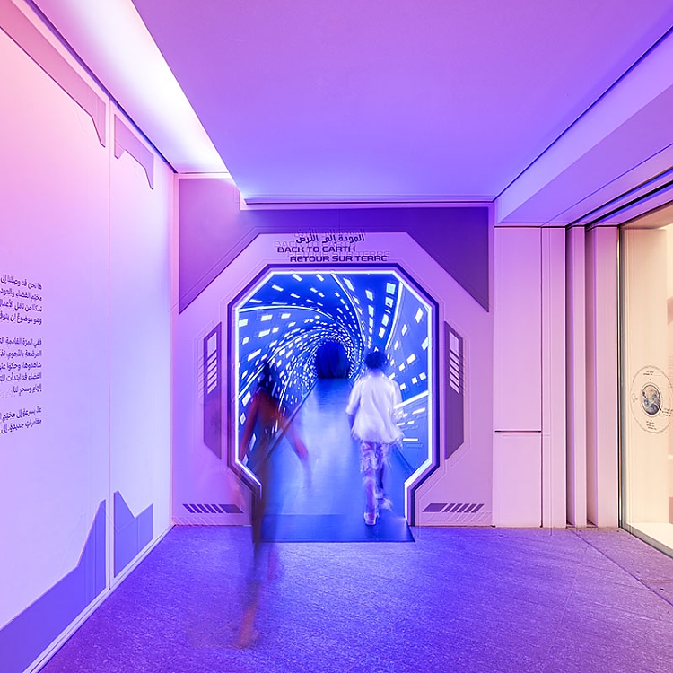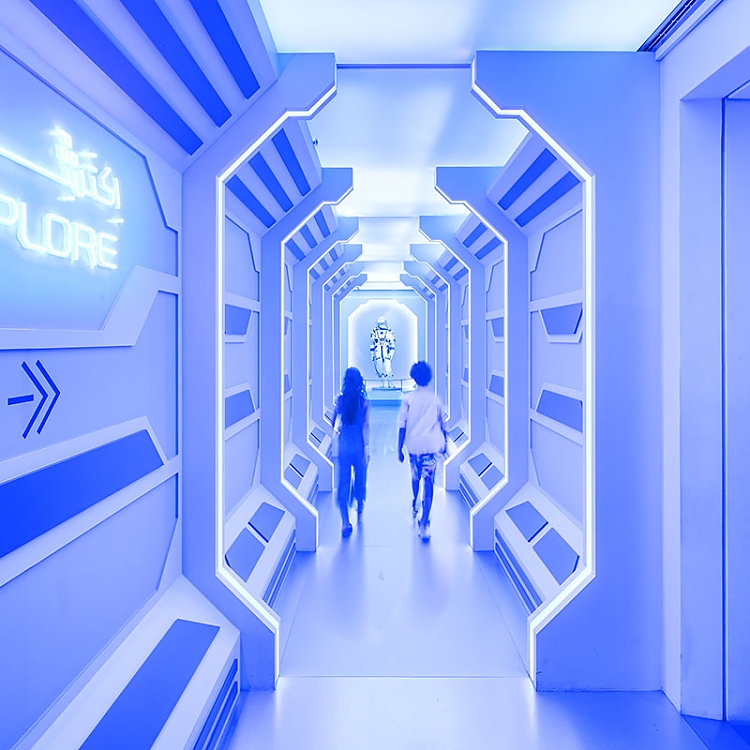 Das Treppenhaus, mit eindrucksvoller Lichtinszenierung, bildet den Auftakt zur eigenen Expedition ins All. Das erste Obergeschoss "Explore“ gleicht einem Raumschiff. Hier geht es um die Raumfahrt und entsprechende Forschungsexperimente. Eingespielte Filme aus einem Emirati Space Ship machen das Erlebnis perfekt. Attraktion ist ein originaler Astronautenanzug der UAE Space Agency, der die Besuchenden vom Eingang ins Rauminnere zieht.