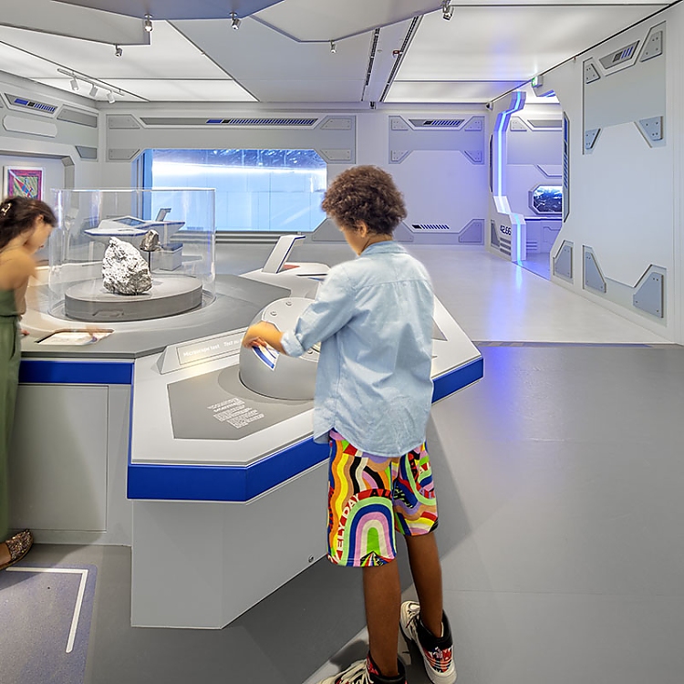 Unterschiedliche Forschungsstationen laden zum Experimentieren ein: Die Kinder untersuchen künstliche Meteoriten hinsichtlich Gewicht und Magnetismus. Am Medientisch "Create your own image of the sky” entdecken sie, wie mittels Farbgebung Teleskop-Bilder leichter lesbar werden und können ihr eigenes Bild erstellen, indem sie Farbanpassungen vornehmen. Der "Spacewalk through Infinity“ bietet zudem ein spielerisches Erlebnis: Die künstlerisch angelegte Rauminstallation arbeitet mit hinterleuchteten Globen und Spiegelwänden. Die abstrakten Himmelskörper ändern ihre Farbe, sobald sich die jungen Museumsbesucherinnen und -besucher nähern.
