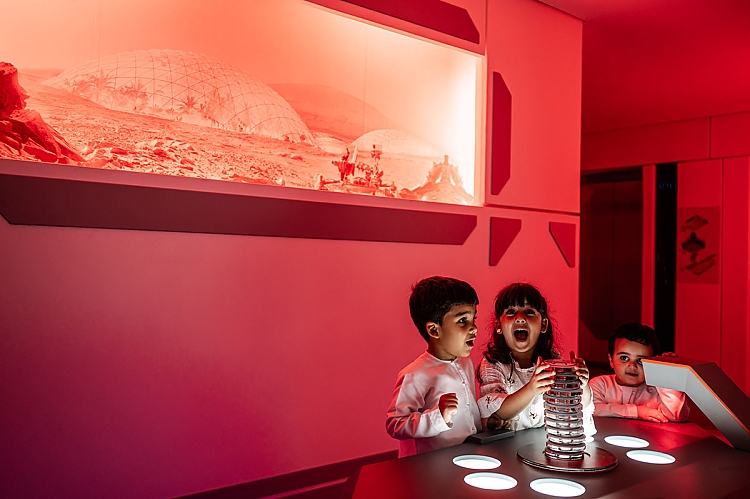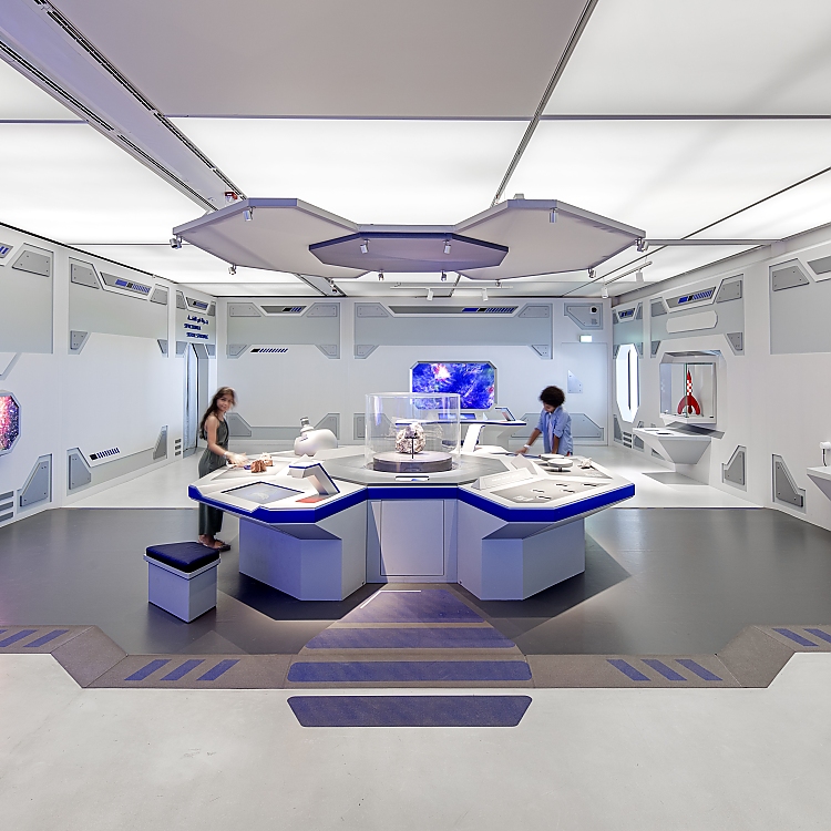 Jede Etage ist anders gestaltet: dunkel und magisch wie ein Sternenhimmel das Erdgeschoss, technisch und hell wie ein Raumschiff das Obergeschoss und ganz in Orange getaucht das Untergeschoss, in dem sich der Mars erkunden lässt. Die jungen Museumsbesucher und -besucherinnen tauchen in Erlebniswelten