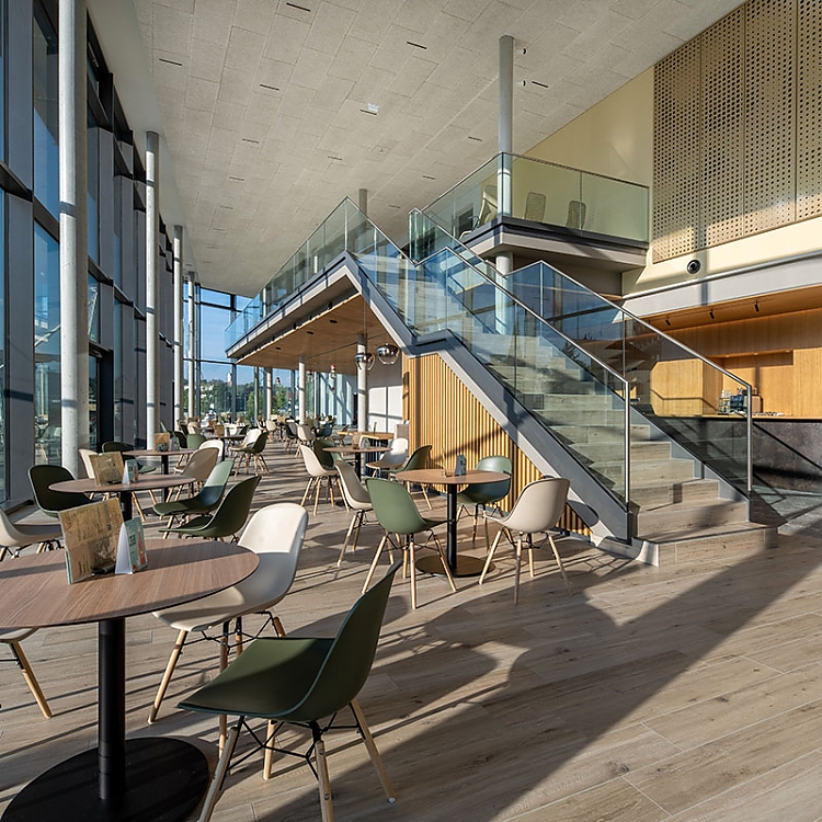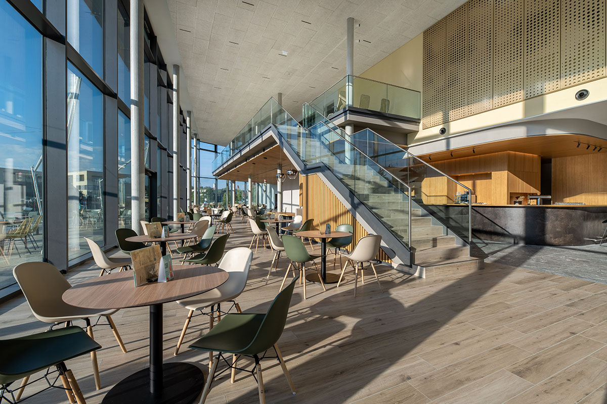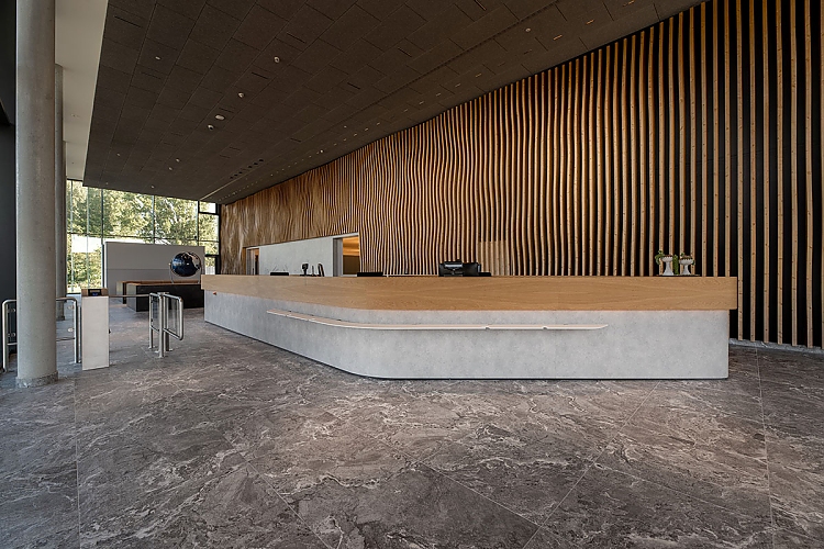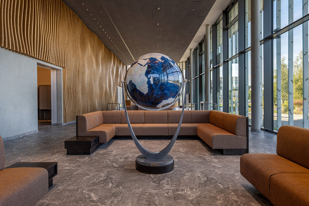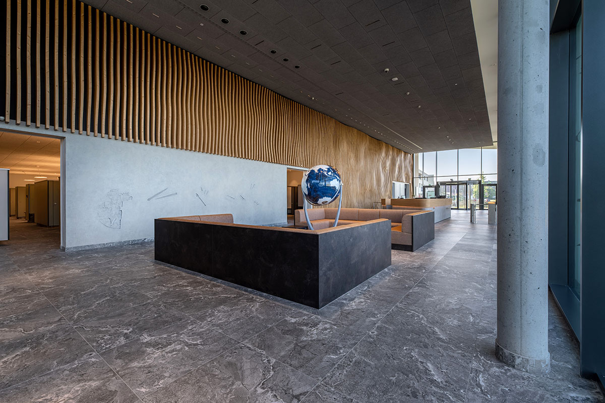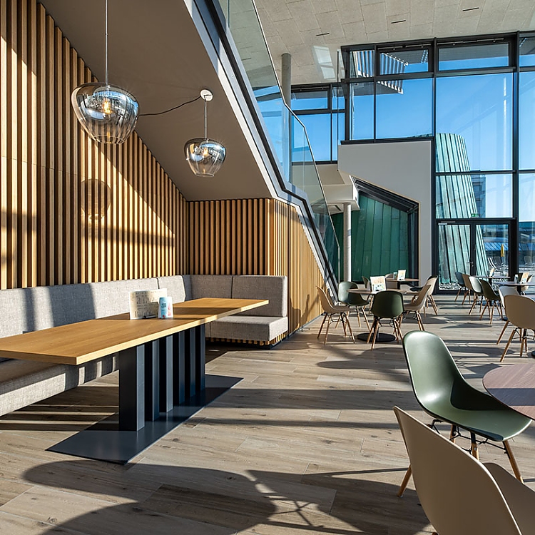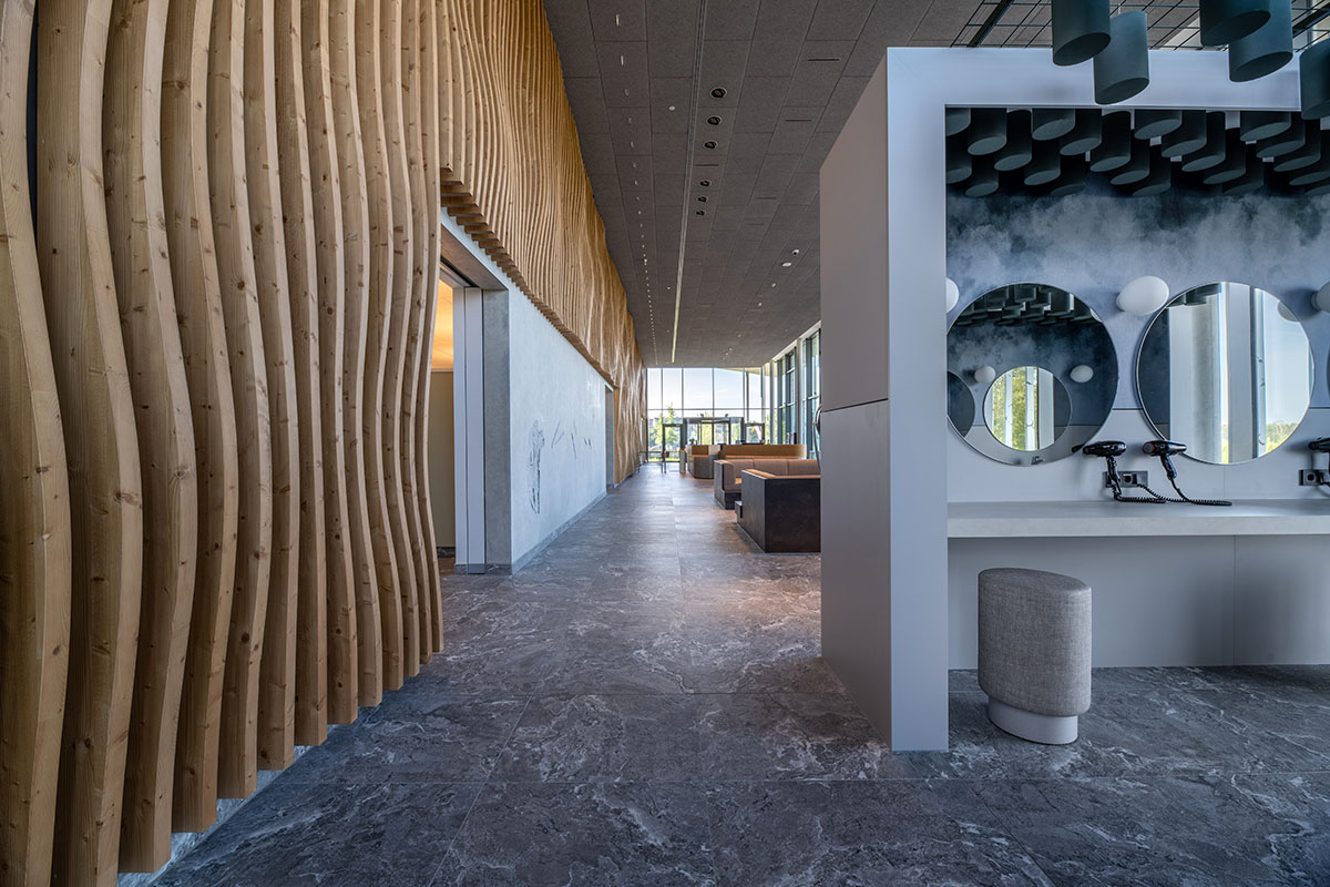 Auch die dreidimensionale, wellenförmige und aus Holzlamellen bestehende Wand im Eingangsbereich ist eine Anmutung des Federsees, spiegelt diese die Topographie des Sees wider.