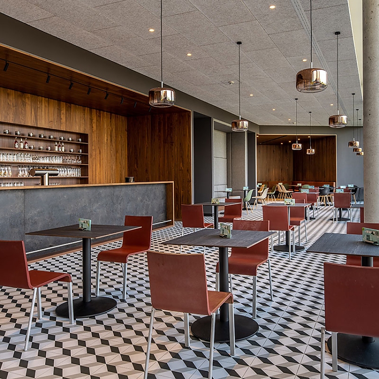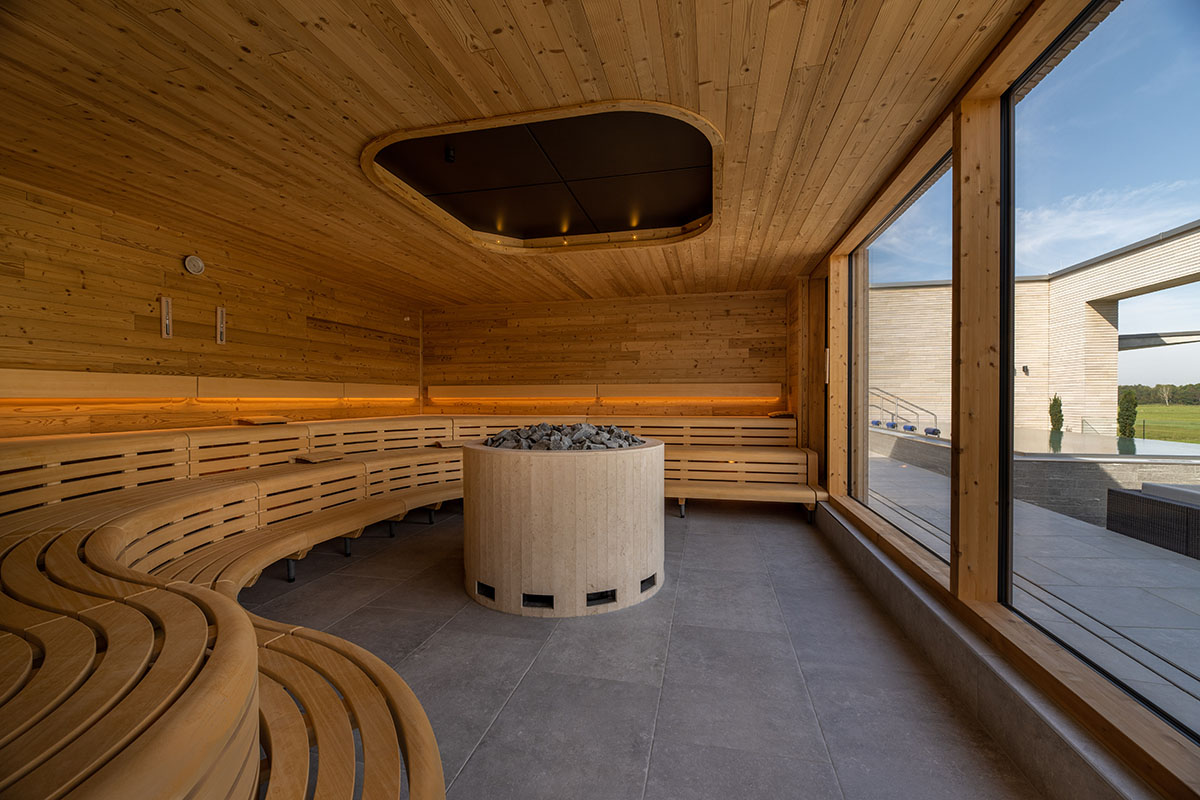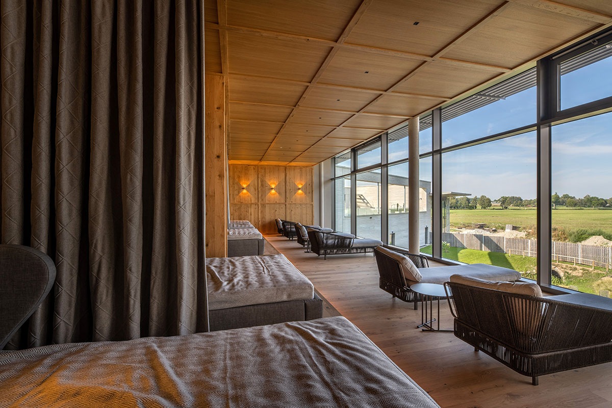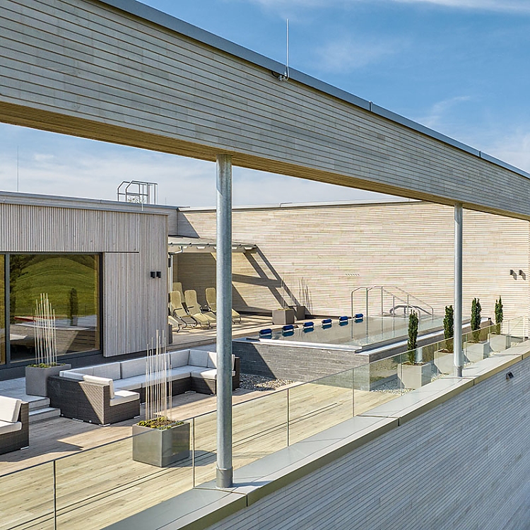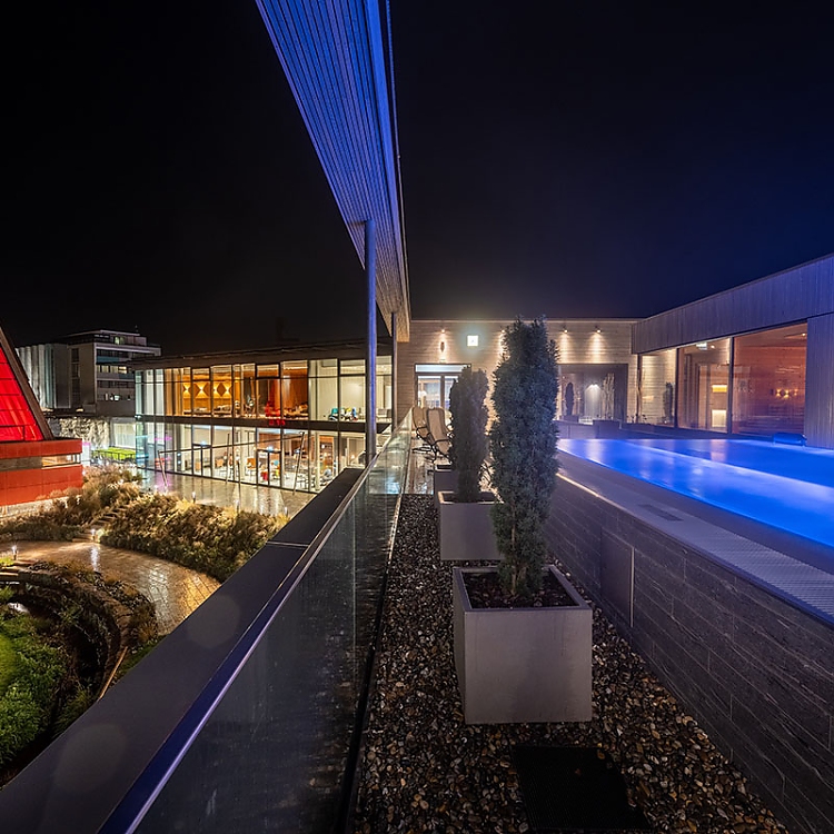 Bei der Gestaltung der Adelindis Therme im schwäbischen Bad Buchau konnte Geplan Design auf rund 2.300 qm sein kreatives Können im Eingangsbereich, in den Umkleiden, der Gastronomie mit Außenbereich, mehreren Ruheräumen sowie dem Dachgarten mit Panorama-Sauna und Relax-Panoramapool ausspielen. Zudem haben die Designer den Entwurf für die Sanierung des bestehenden Außenbereichs mit Becken entwickelt.