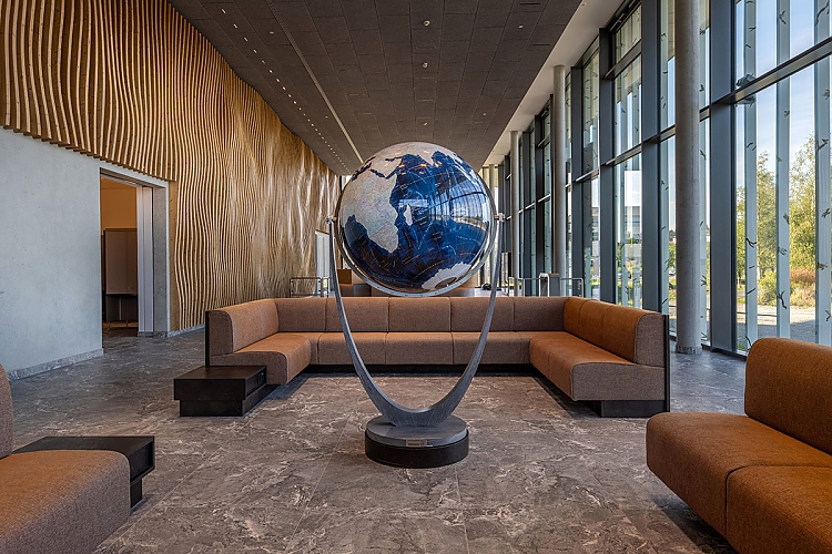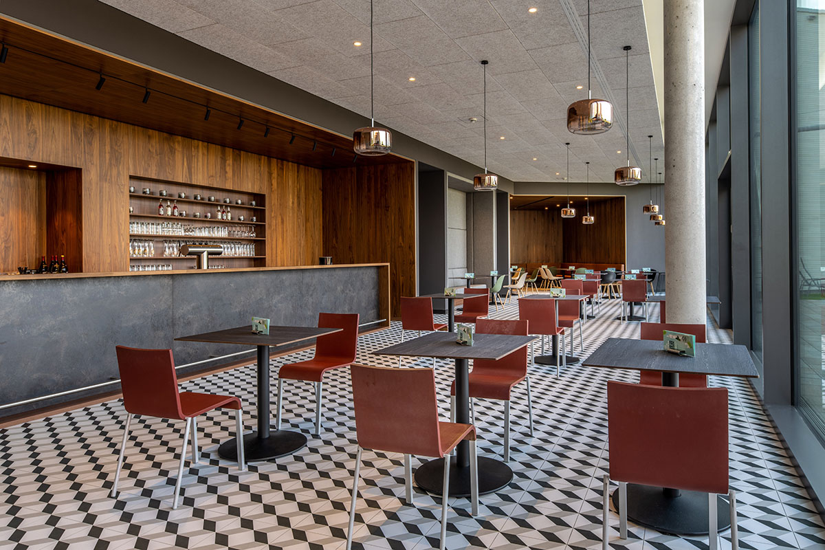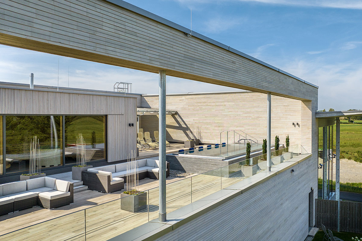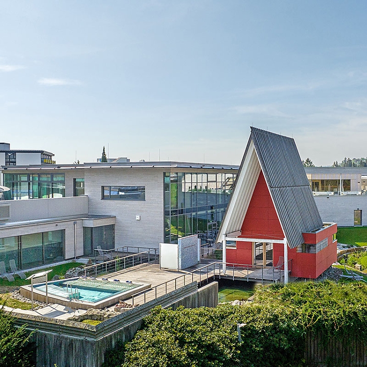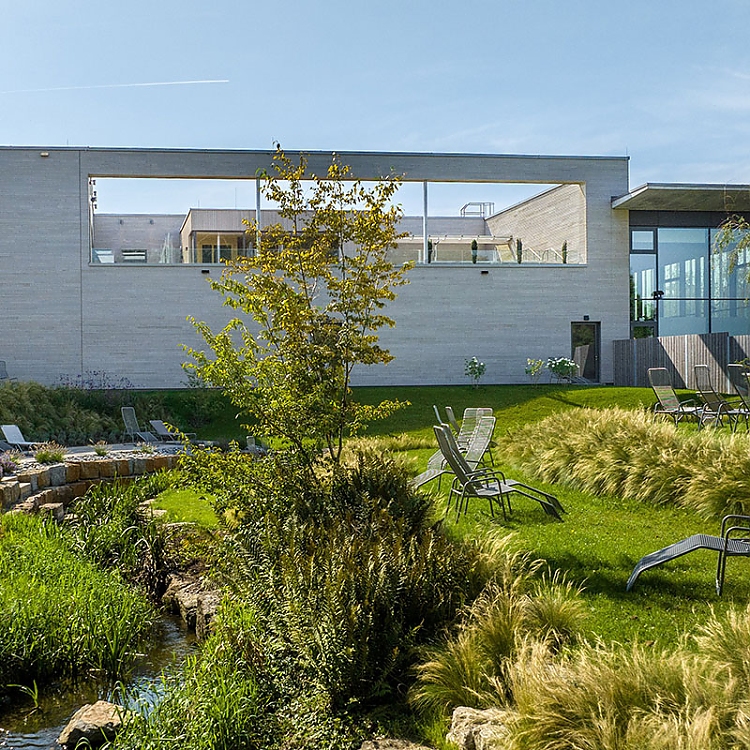 Die Adelindis Therme gehört zum Gesundheitszentrum Federsee, und genau dieser hat einen maßgeblichen Einfluss auf das Interieur genommen, ebenso wie die naturnahe Region. In der großzügigen Eingangshalle wird mit in die Betonwand eingearbeiteten Steinzeitfunden aus Bad Buchau bereits der Ortsbezug deutlich.