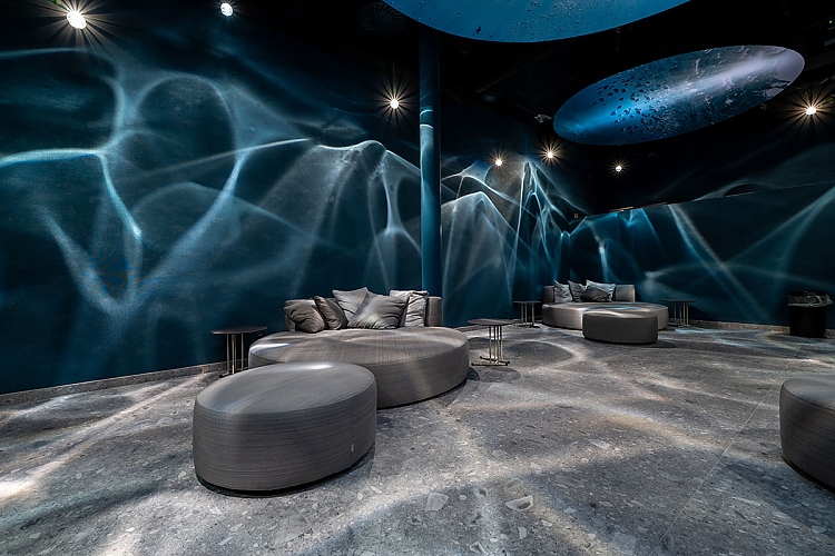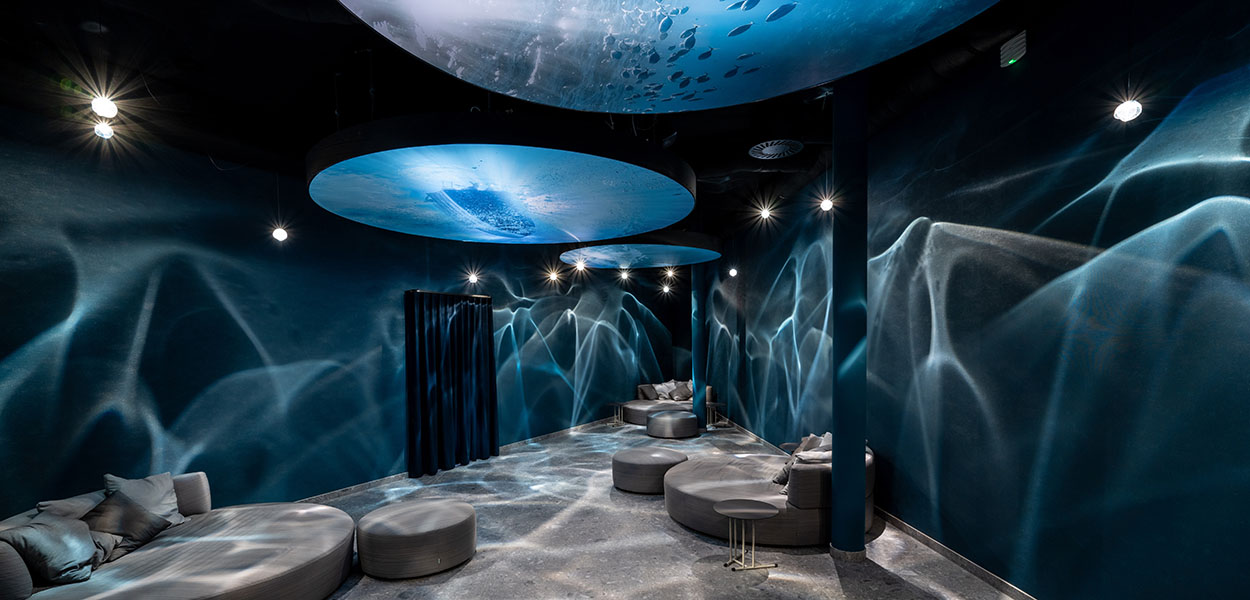 Auch in den thematisch gestalteten Ruheräumen kommt dies zum Ausdruck. So im Ruheraum "Abtauchen" mit seiner dunkelblauen Farbgebung und den runden Scheibenleuchten, die an eine spiegelnde Wasseroberfläche erinnern.