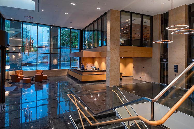 Im Eingangsbereich des Hotels nimmt die Rezeption in einer weitläufigen Halle die Gäste in Empfang. Rechts führt eine Treppe nach oben in die einladende Hotellobby, die direkt mit einer Besonderheit aufwartet: Ein Teilbereich lässt sich in einen Tagungsraum verwandeln. Über eine Trennwand kann hier an prominenter Stelle direkt beim Eingang eine Fläche von etwa 170 qm von den öffentlichen Bereichen abgetrennt und für Konferenzen genutzt werden. Die offene Gestaltung des Raums ermöglicht nicht nur einen freien Blick auf Donau und Schloss, sondern auch auf die Lobby und die Rezeption des Hotels.