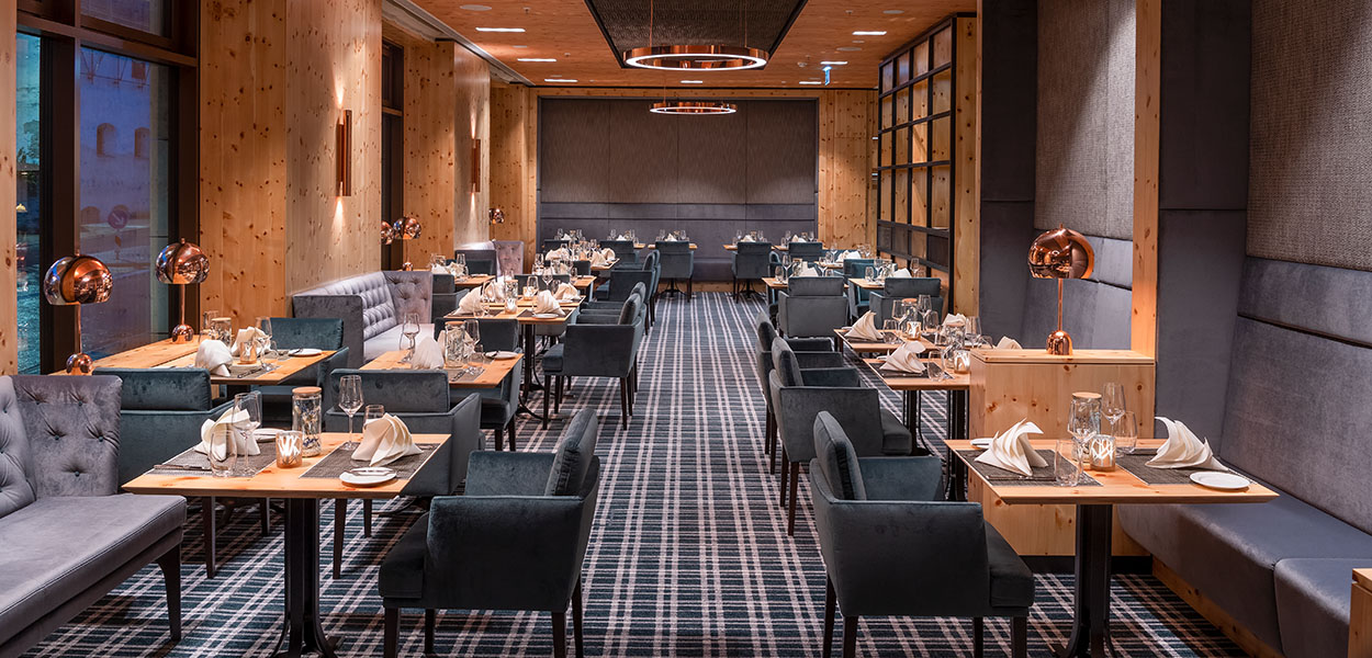 Im Bistro Ingold im Maritim in Ingolstadt wird bayerische Gemütlichkeit in ein zeitgemäßes Raumflair verwandelt. So ist das Karo-Muster des Teppichs ein eigens entwickeltes Unikat. Fotos: vision photos