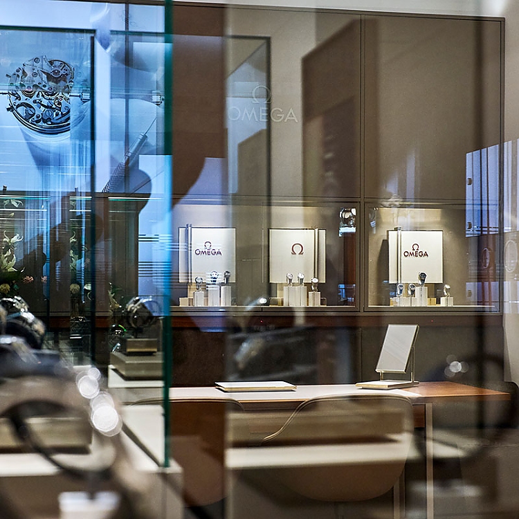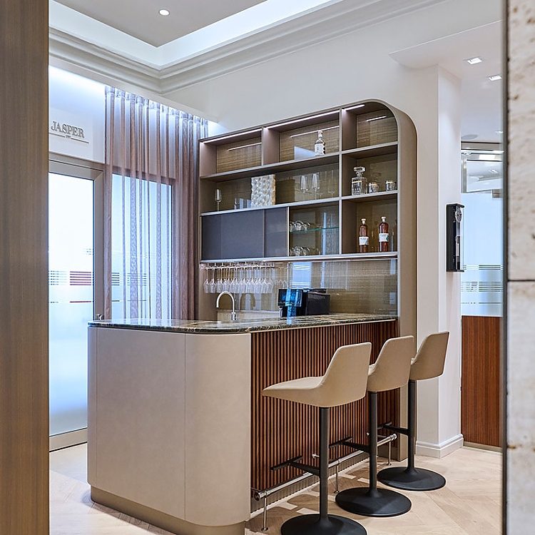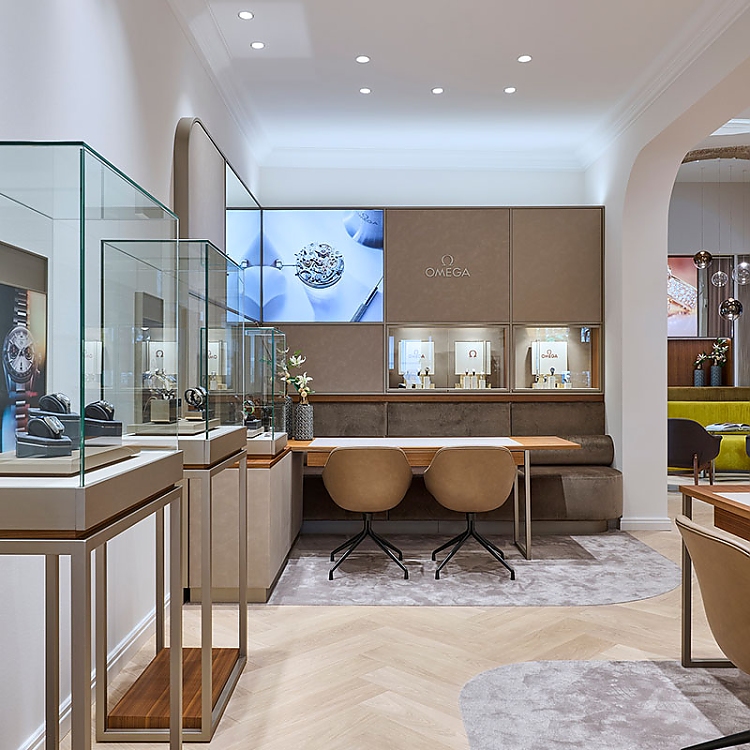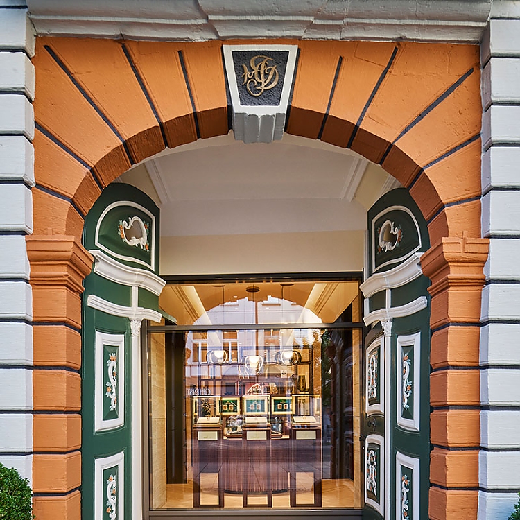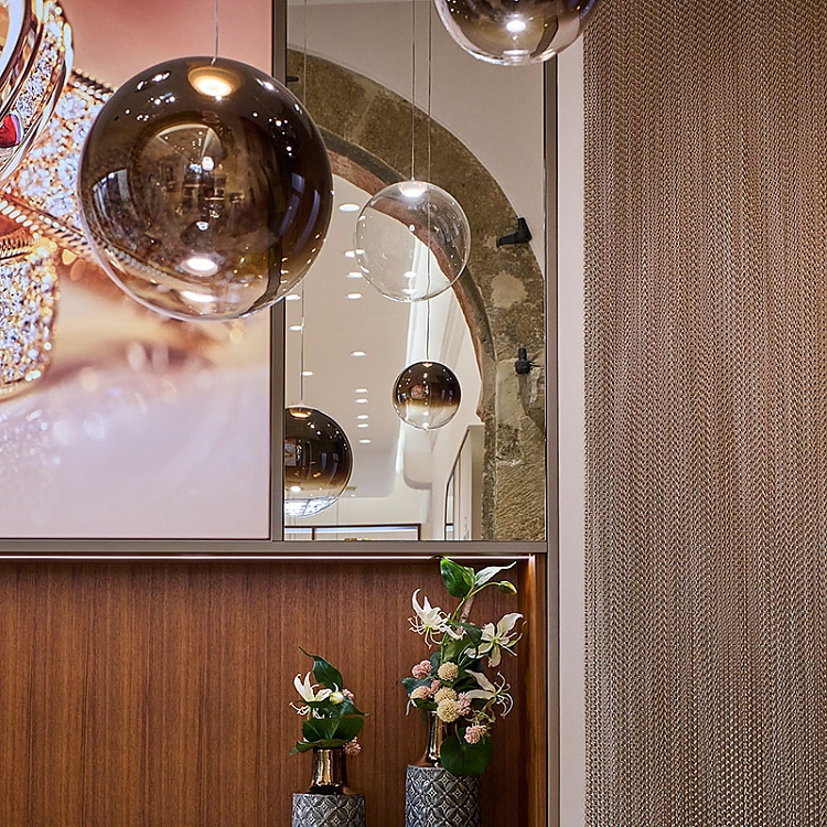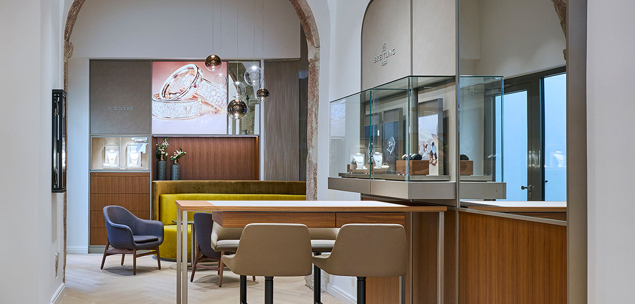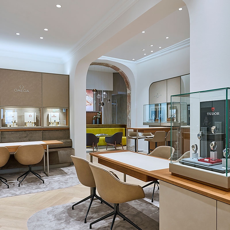 Erhaltene historische Elemente wie das barocke Holztor in der Hofdurchfahrt wurden denkmalgerecht aufgearbeitet. Die Bestandsflächen im Innern erhielten ein gestalterisches Facelift. Um die räumlichen Erweiterungen hervorzuheben, antizipiert deren Interior Design mit einer eigenen Sprache die Traditionswerte des Juweliers und die Anforderungen an moderne Verkaufsflächen. Für die Produktwelten und Beratungssituationen entstanden verschiedene Kompetenzbereiche. So sind gepolsterte Stühle und Sessel mit Tischen zu unterschiedlichen Rauminseln kombiniert, um die Fläche zu gliedern und diskrete Gespräche zu ermöglichen. Das verbindende Zentrum des Fachgeschäfts ist eine hochwertige Bar aus Nussbaum, Naturstein, Leder und veredeltem Strukturglas. Hier trifft man sich zum Verkaufsgespräch oder zum entspannten Austausch bei einem Getränk.