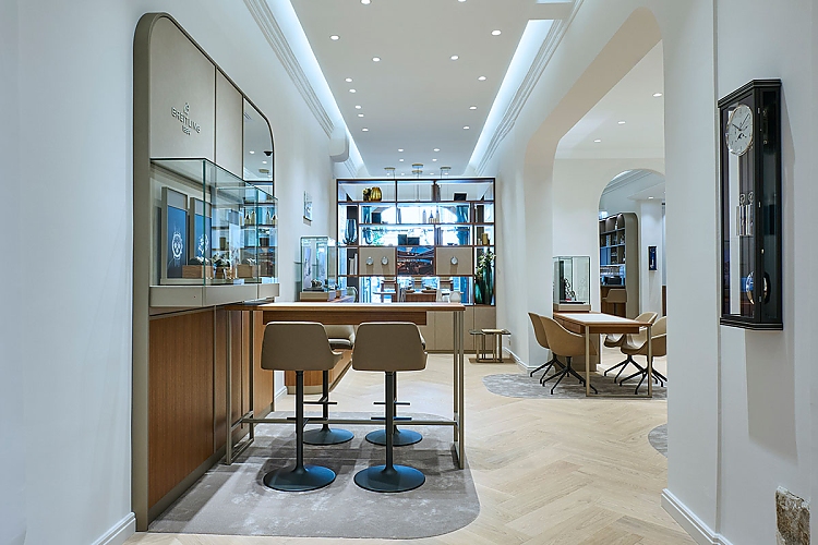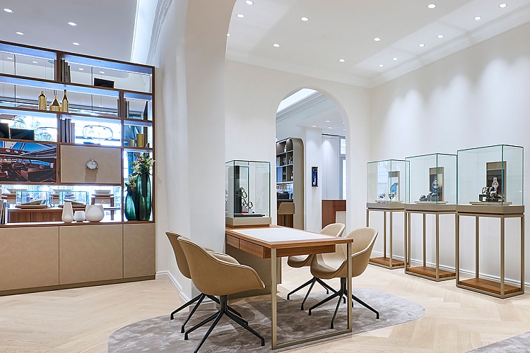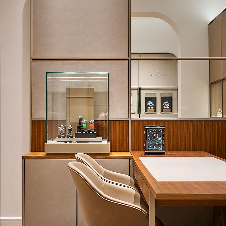 Für die visuelle Verbindung der erweiterten Flächen sorgt ein wohldosiertes Material- und Farbkonzept. Warme Holz- und Creme-Töne prägen das elegante und zugleich einladende Ambiente. Optische Bezüge bildet auch ein durchgehendes Eichenparkett in Fischgrät-Verlegung, während hochwertige Teppichböden die Beratungsinseln markieren. Maßgefertigte Wandverkleidungen mit Nussbaumfurnier, Ledereinsätzen und eloxiertem Metall verweisen auf den erlesenen Charakter der ausgestellten Uhren und Schmuckstücke. Betont wird diese entspannte Noblesse noch mit dem filigranen Design der Glasvitrinen, die als Hingucker und Raumteiler wirken.