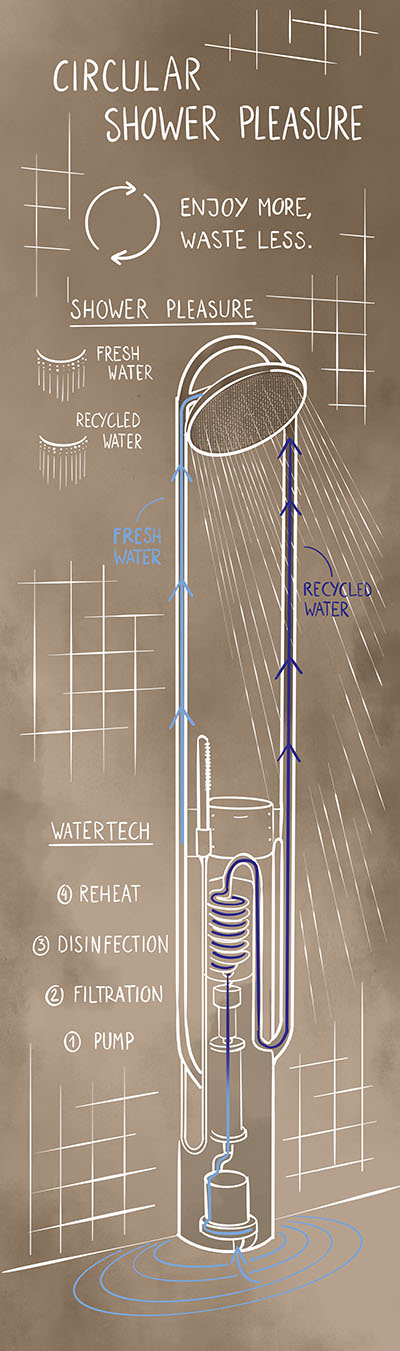 Eine weiteres Produktkonzept, an dem das Team des Hansgrohe lnnoLabs forscht, soll das Potenzial von zirkulärer Wassernutzung ausschöpfen: Beim Konzept der Kreislauf-Dusche wird das gebrauchte Duschwasser gereinigt, nacherwärmt und im Kreislauf wiederverwendet. Auch wenn derzeit die Regularien in vielen Ländern aufbereitetes Wasser nicht zum Duschen vorsehen, könnten sich die Vorgaben angesichts der Verknappung von Süßwasser in Zukunft ändern. Dann könnte eine technisch ausgereifte und sichere Technologie eine willkommene Lösung im jeweiligen Markt sein.